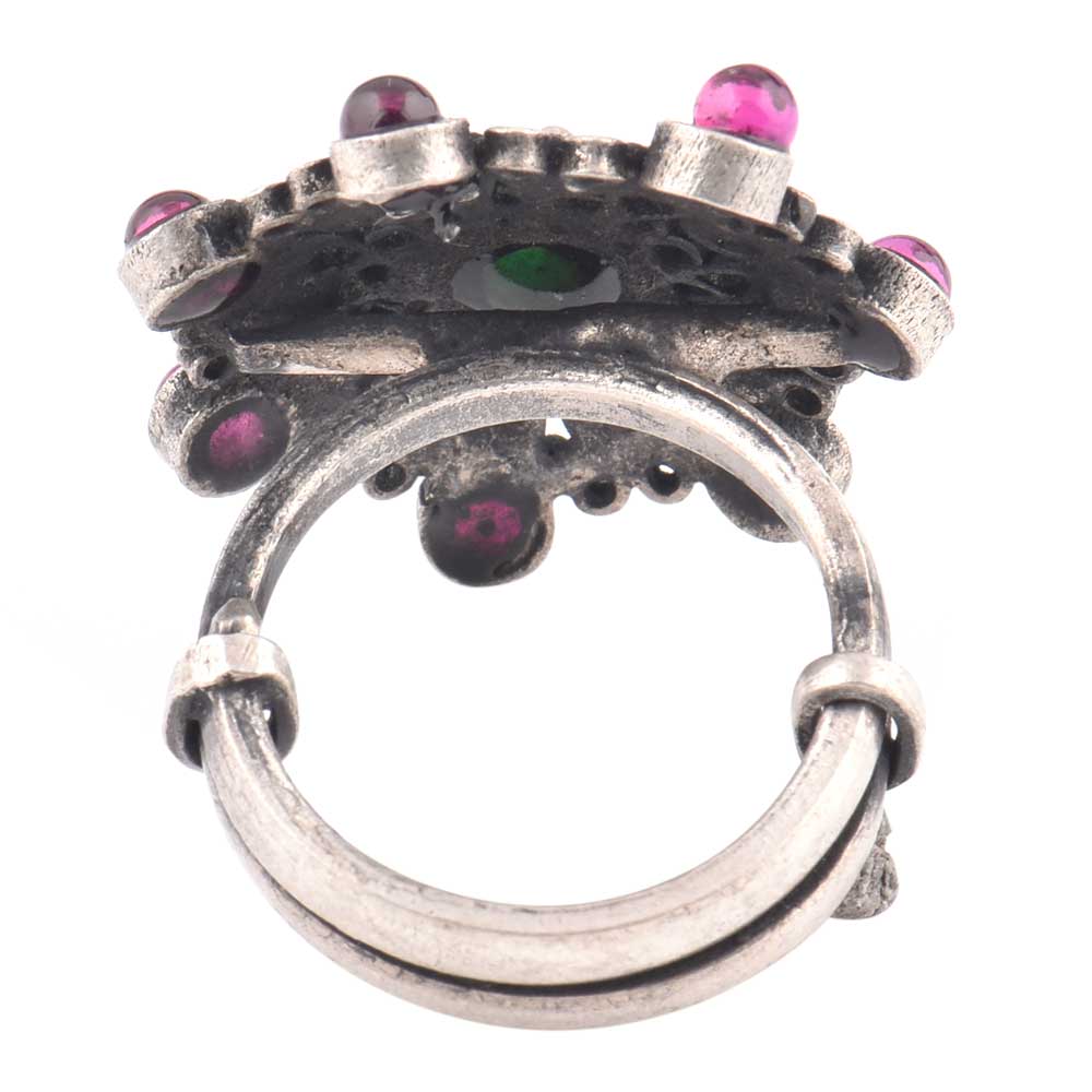 • 92.5 Sterling Silver Ring with Seven Amethyst Traditional Motifs And Green Onyx (Free Size)