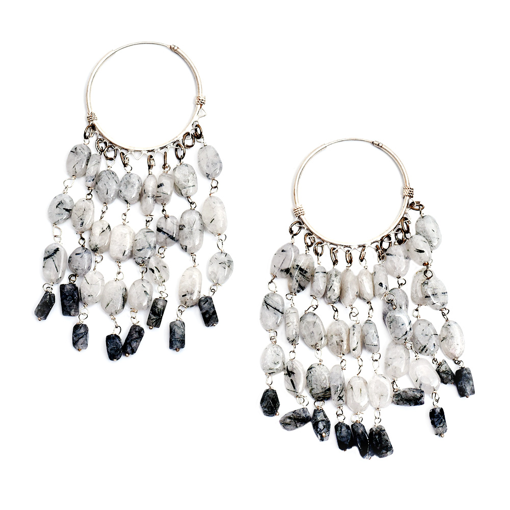 92.5 Sterling Silver Tribal Grey And White Beaded Hoop Earring
