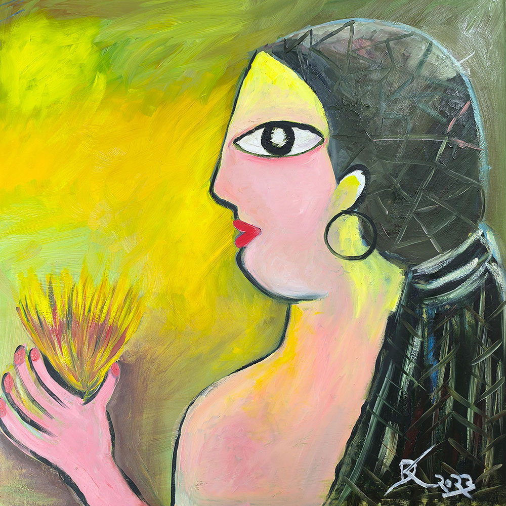 This captivating oil painting on stretched canvas presents an abstract portrayal of feminine strength and grace. The artist uses bold outlines and vibrant, luminous colors—rich yellows, soft pinks, and deep greens—to beautifully depict a woman in profile, confidently holding a glowing flame. Her expressive, oversized eye symbolizes clarity, wisdom, and vision, while the flame represents passion, resilience, and inner strength. Textural brushwork brings depth and vitality to the composition, capturing the powerful spirit of femininity. Perfect for inspiring confidence and vitality, this artwork adds warmth, depth, and elegance to any contemporary setting.