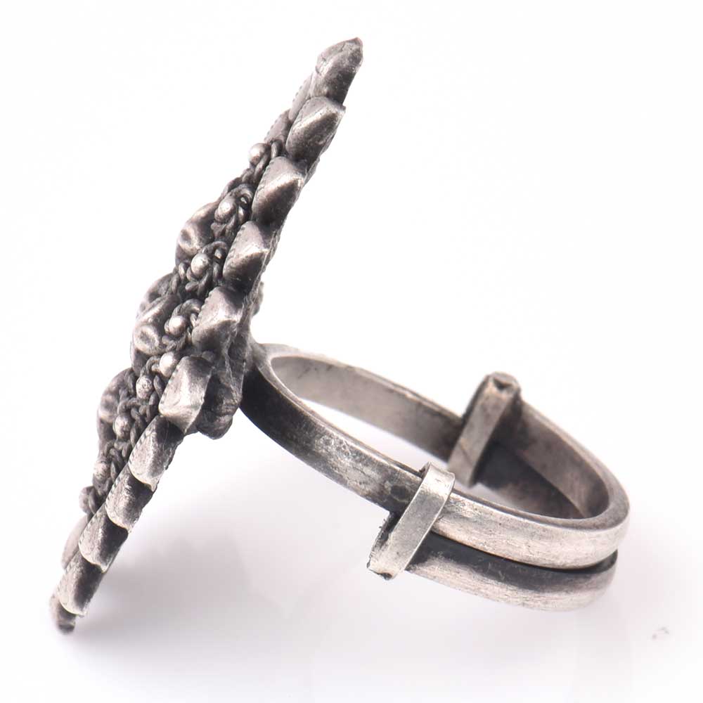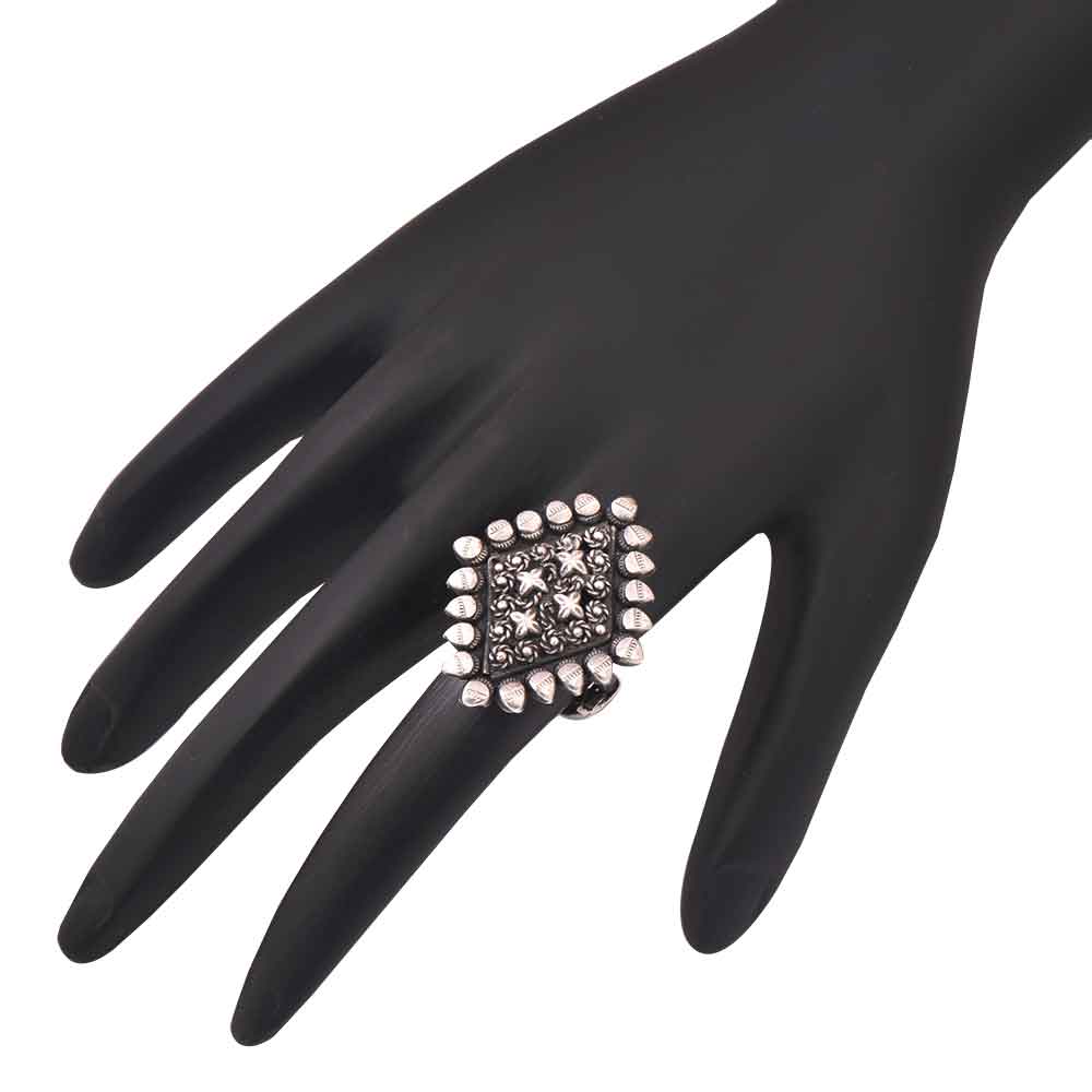 This is handmade 92.5 Sterling Silver ring is the shape of diamond with engraved floral design . It is adjustable to your finger and comes in oxidized color and thus suits all kinds of traditional as well as modern attire. Great gift for your near and dear ones on Diwali, Anniversaries, birthdays , souvenir , parting gift et.