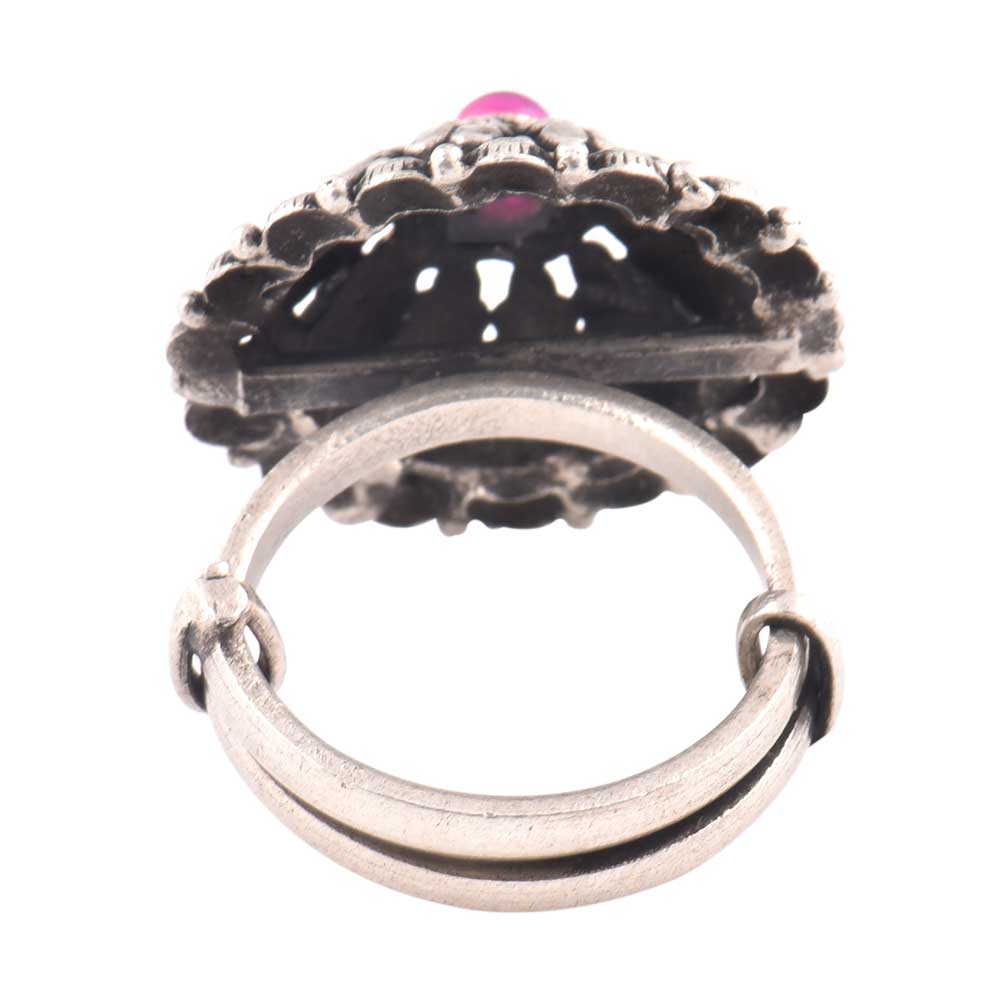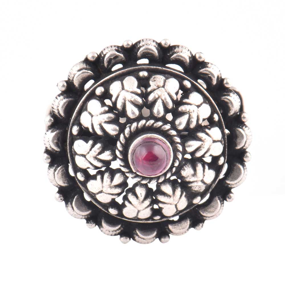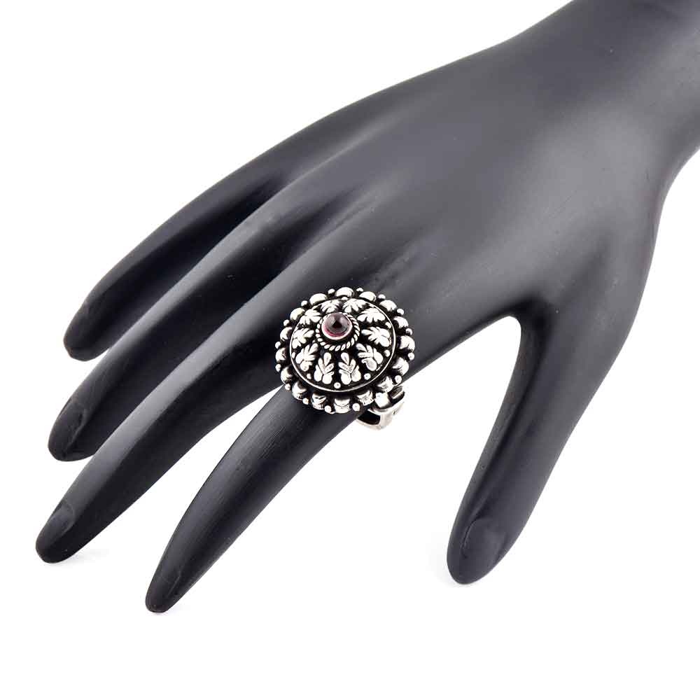 A very decorative oxidized 92.5 Sterling Silver Ring that can be adjusted according to the size of the finger. The round ring has leaves and flowers engraved with a small round amethyst stone studded in the centre .Gift it to your sister, mother ,wife or that special friend on weddings, engagements, festive decorations.
