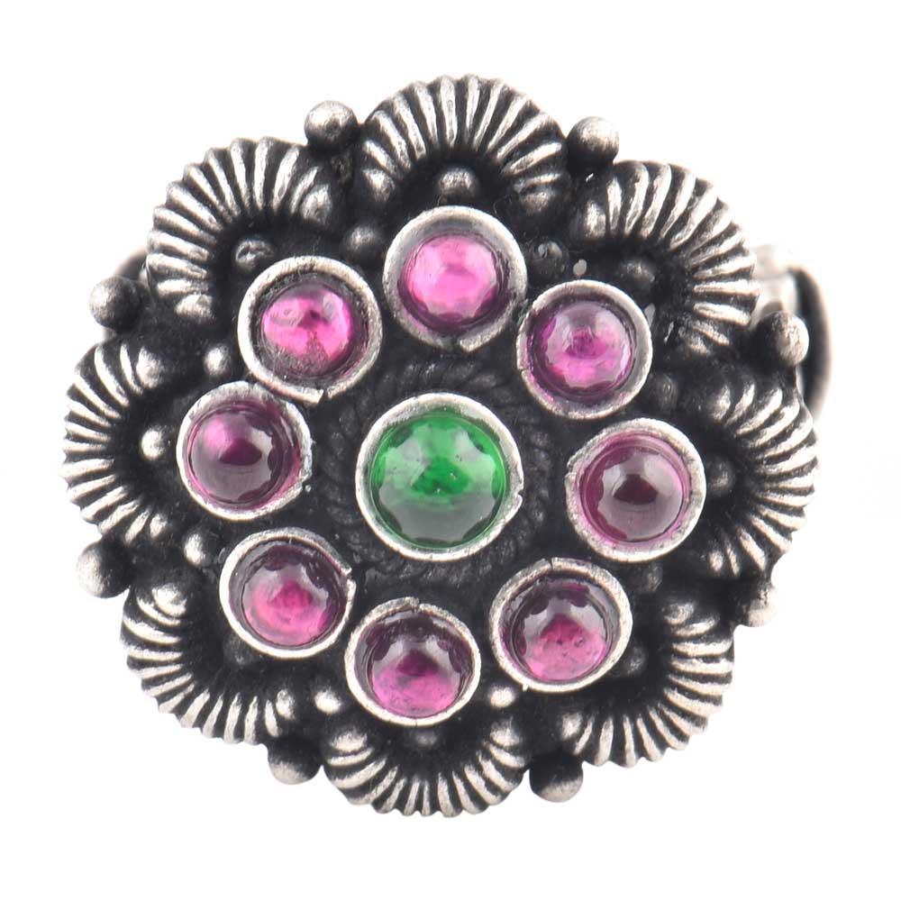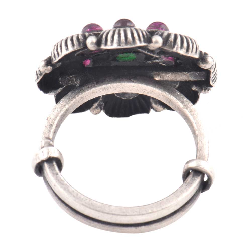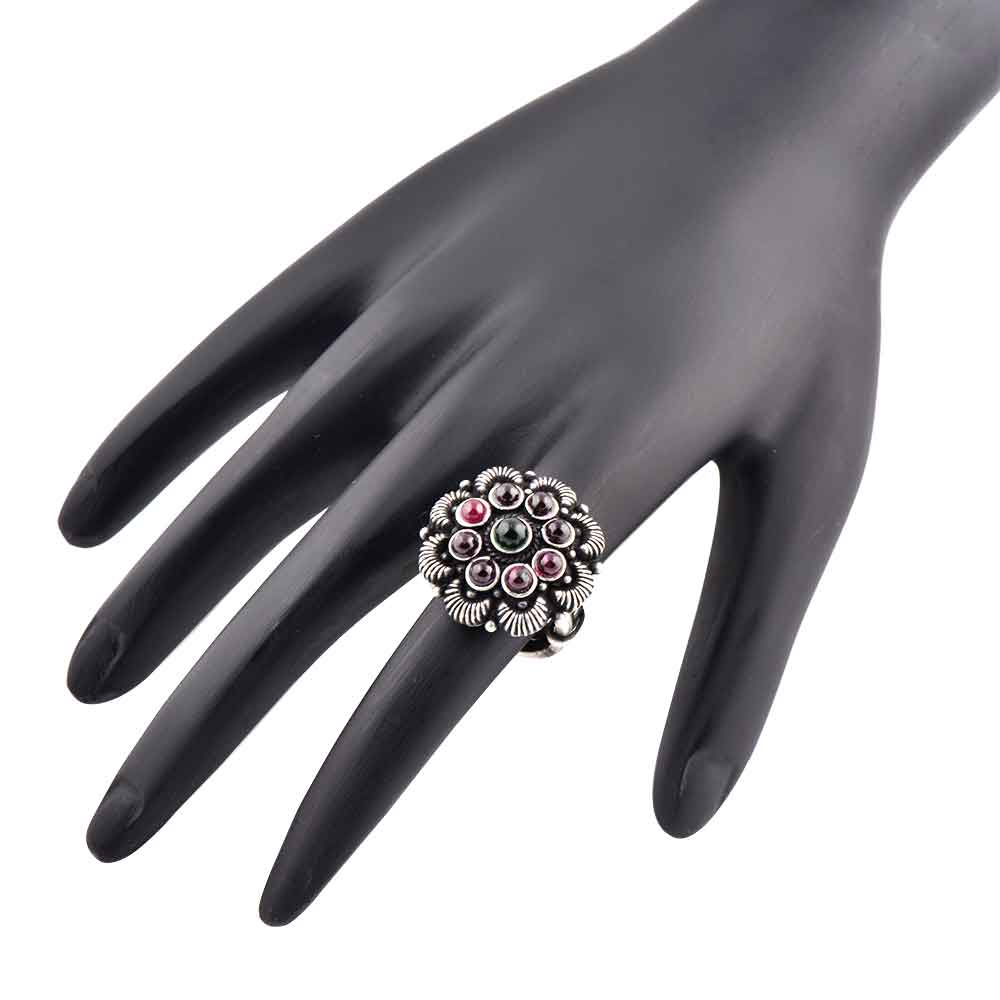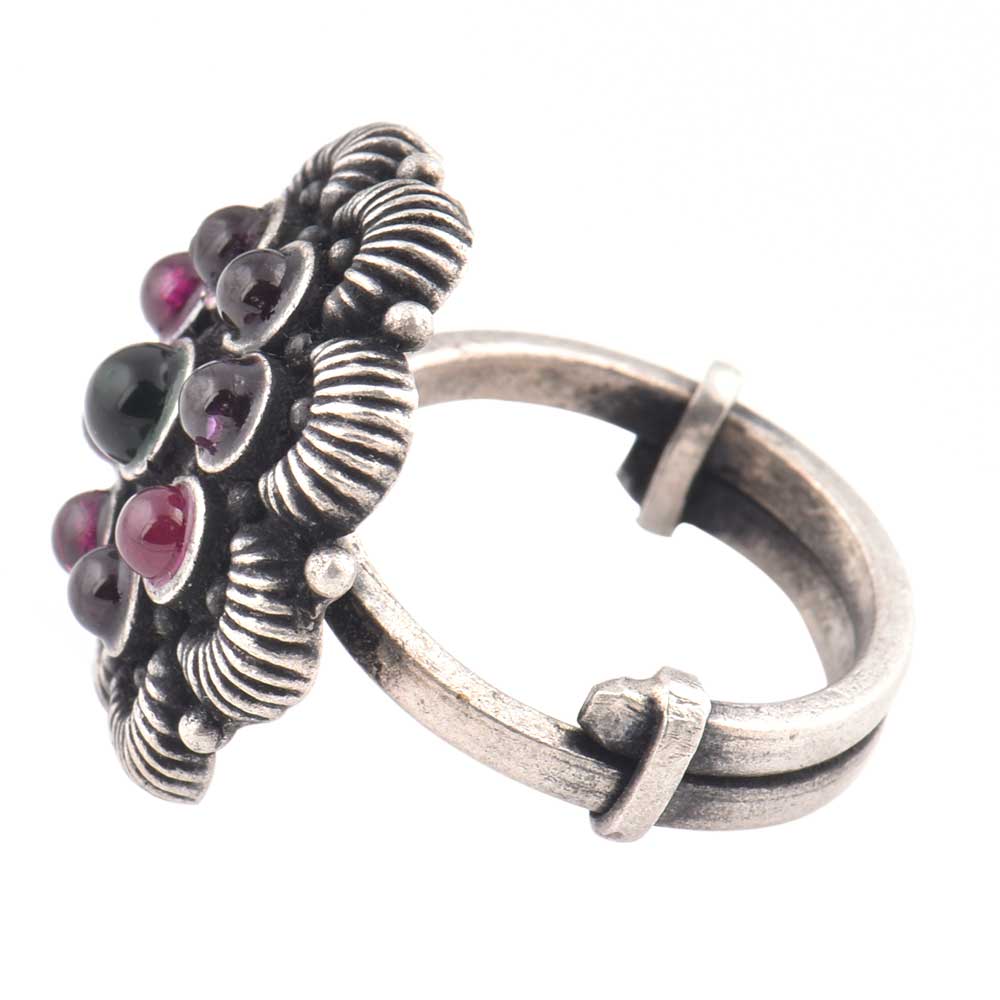 • Adjustable Oxidized 92.5 Sterling Silver Ring Petals Round Amethyst And Onyx Stones (Free Size)