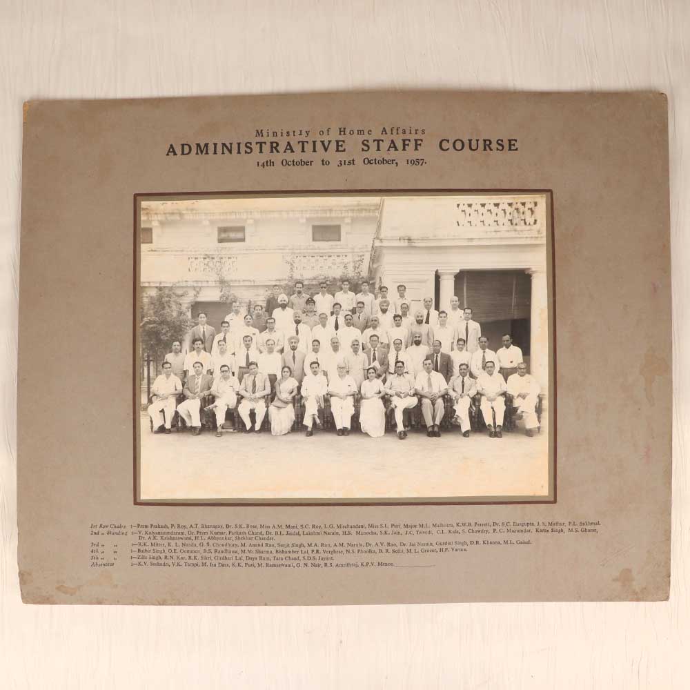 Transport yourself back in time with this one-of-a-kind vintage photograph from 1957. This striking black and white image captures the administrative staff from the Ministry of Home Affairs gathered for their training course. Their classic attire and serious expressions provide a glimpse into a past era. This rare find allows you to own a piece of history. Display this conversation starter to appreciate how work and fashion have evolved over time. Let this window into the past ignite your imagination. Who were these people and what was their story? With this vintage photo you can reflect on a bygone time that still influences our world today. Perfect for history buffs, antique collectors, and anyone who wants to surround themselves with artifacts from the past. Add this one-of-a-kind vintage photo to your collection today. Key features include: