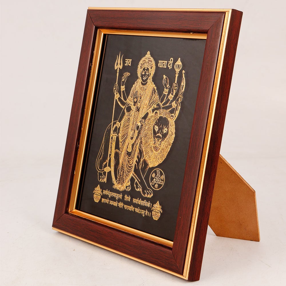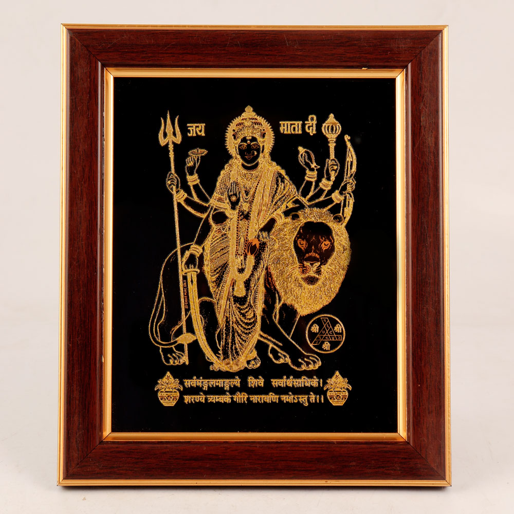 Evoke a sense of divine grace and timeless beauty with this exquisite glass painting of Goddess Durga. Set against a captivating black background, the painting radiates an aura of mystique and strength. The intricate 22 carat gold work adds a touch of opulence, casting a shimmering glow that captures the eye from every angle. The painting is skillfully encased in a finely crafted wooden frame, enhancing its elegance and ensuring its durability. Perfectly versatile, this stunning piece finds its place in various settings – be it at home, in an office, a restaurant, a hotel, or a cafe – adding a touch of spiritual charm to the ambiance. It is equally suitable for both decoration and creating a tranquil prayer space. Temples and prayer rooms are enhanced by its divine presence, fostering an atmosphere of devotion. Beyond its aesthetic appeal, this glass painting makes for a thoughtful and meaningful gift. Ideal for special, festive, or auspicious occasions, it conveys blessings, protection, and positivity. Present it to your near and dear ones, and you're gifting them a cherished token that resonates with both beauty and spirituality.