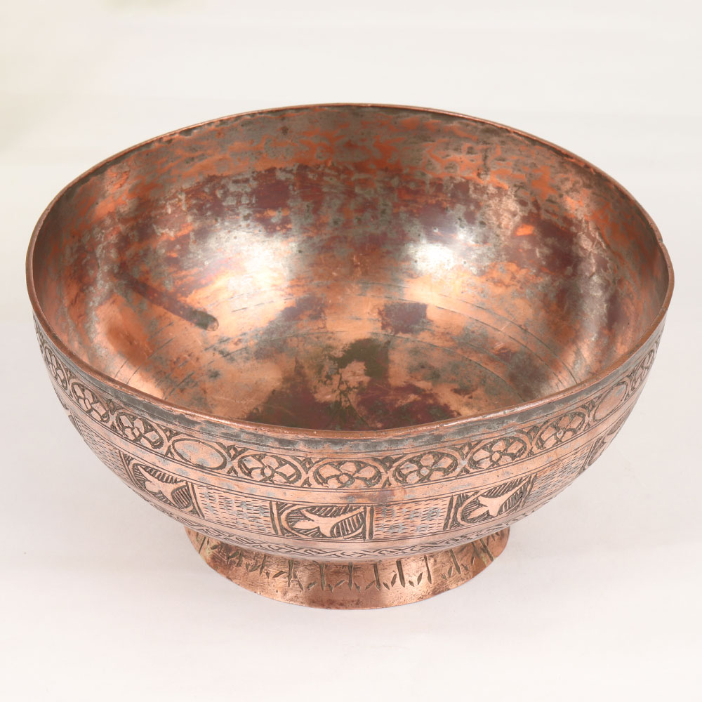 Step into the enchanting world of timeless elegance with our exquisite vintage Copper Bowl. Meticulously handcrafted by professional artisans in the distinguished tradition of Islamic Art, this masterpiece is a testament to the artisanal mastery passed down through generations. The bowl boasts a rich, antique brown finish that adds warmth and character to any space. The intricate engravings on the surface tell a story of craftsmanship and dedication, making it a unique and captivating addition to your decor. Its versatile design allows it to grace your home, office, restaurant, hotel, or cafe with a touch of old-world charm. Embrace the fusion of art and functionality by using it as an indoor flower pot, bringing life and nature indoors. This vintage Copper Bowl transcends its utilitarian origins to become a statement piece, worthy of inclusion in any vintage collection. Its timeless appeal makes it a thoughtful and meaningful gift for your loved ones on special, festive, or auspicious occasions.