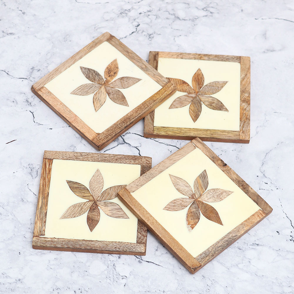 Enhance your home decor with a Wooden Tea Coaster Set which is a masterpiece crafted from high-quality wood by professional Indian artisans. This set includes four coasters, each designed with a timeless square shape that brings elegance to any surface. The coasters feature a cream background with a brown colour border, enhancing their aesthetic appeal. In the center of each coaster, a beautifully engraved flower adds a touch of artistry, making these coasters not just functional but also decorative pieces for your home or office. These Handmade Wooden Coasters are not only visually stunning but also serve a practical purpose. They are perfect for holding water, tea, juice, or coffee glasses, protecting your surfaces from unsightly stains. Whether you\'re at home, in the office, at a restaurant, hotel, or cafe, these coasters will add a touch of sophistication to your beverage experience. Additionally, this Wooden Tea Coaster Set makes an ideal gift for your loved fours on special or festive occasions.