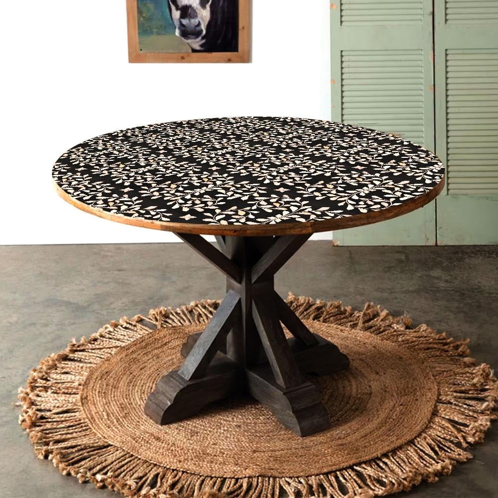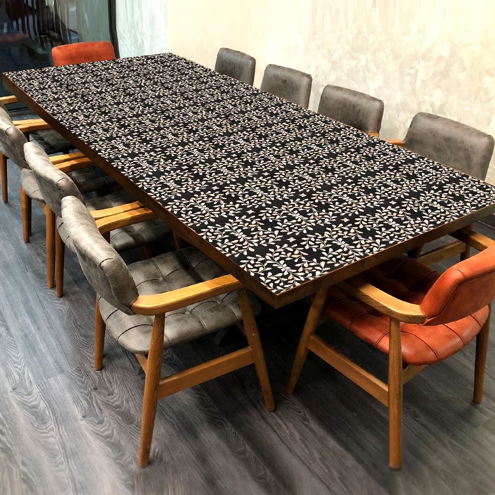 A table top with a stunning fusion of wood, acrylic, and resin, adorned with an elegant black background and a captivating white leaf pattern engraved with delicate flowers. Handcrafted by skilled Indian artisans, this remarkable piece is a true feast for the eyes, boasting intricate designs that demand admiration. Perfectly placed on your dining table at home, it adds a touch of elegance and sophistication to your living space. Additionally, it serves as a charming decorative accent for coffee tables in restaurants or hotels, creating an inviting ambiance for guests. Crafted with the utmost attention to detail, this table top guarantees longevity and surpasses its counterparts in terms of quality. It is built to withstand the test of time, ensuring it remains a cherished item for years to come. Choose between two enchanting shapes - a graceful circular design or a sleek rectangular one - to suit your personal style and preference. It also makes for a thoughtful and unforgettable gift for your loved ones on special occasions or festive celebrations. Indulge in the beauty and functionality of our acrylic table top, transforming any space into a haven of style and sophistication. Whether adorning a drink table or gracing your patio tables, this remarkable piece promises to enhance any setting with its timeless charm.