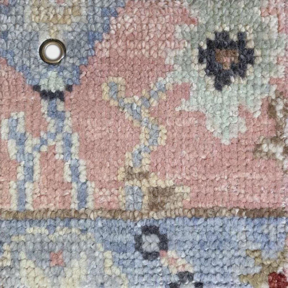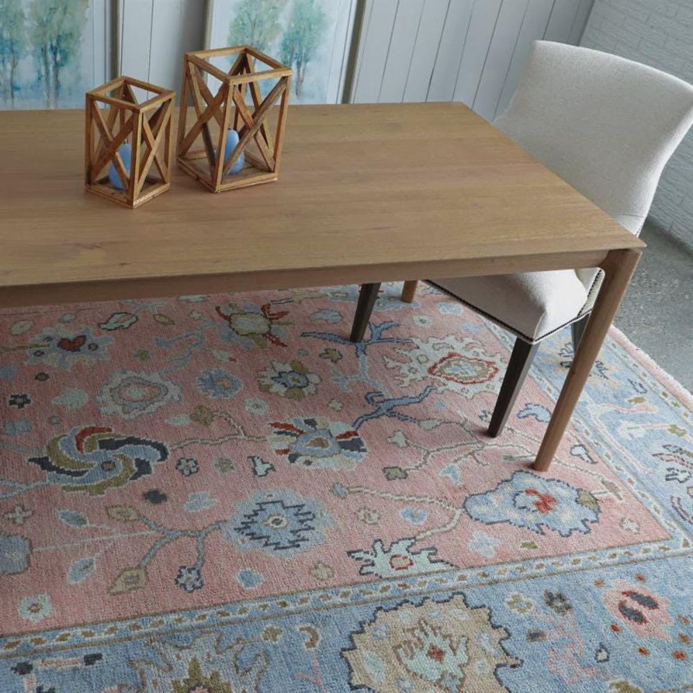 The pastel pink and sky-blue tones combined with handwoven floral motifs create a timeless Oriental masterpiece.
