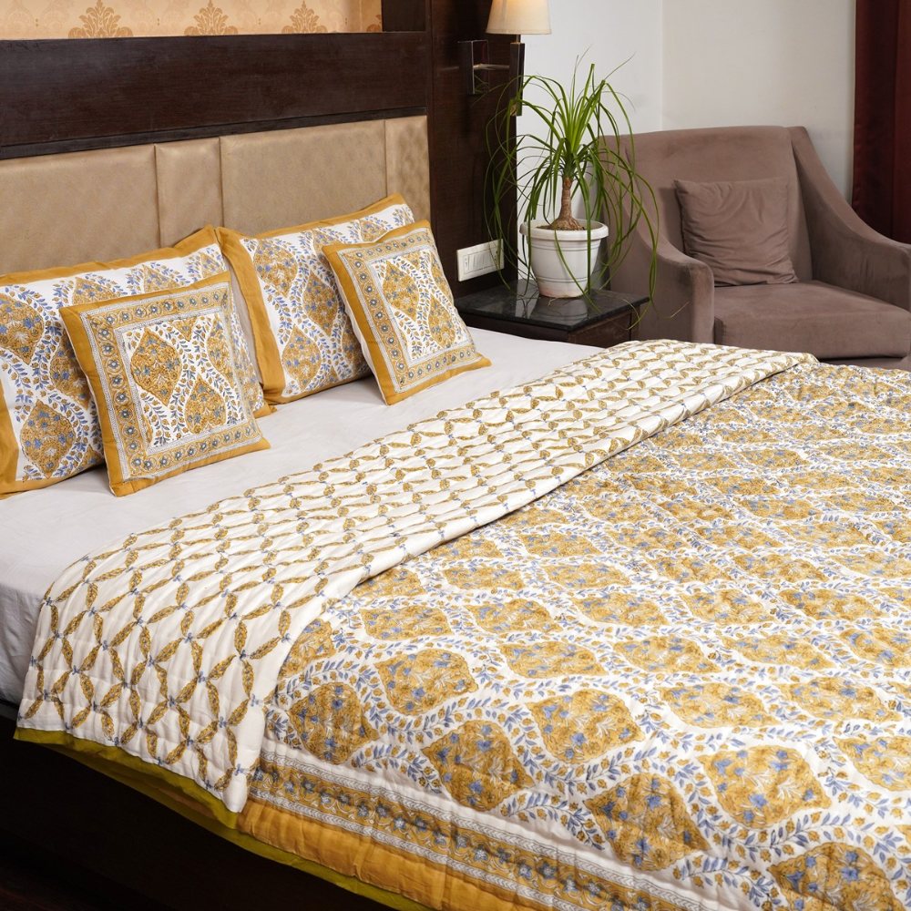 This yellow and grey Malmal (Voile) quilt brings a touch of elegance through its intricate geometric block prints and soothing hues. Crafted from premium cotton voile, it offers lightweight warmth and superior softness. Lovingly handmade and quality-checked by Indianshelf, this quilt beautifully merges comfort with heritage design.
