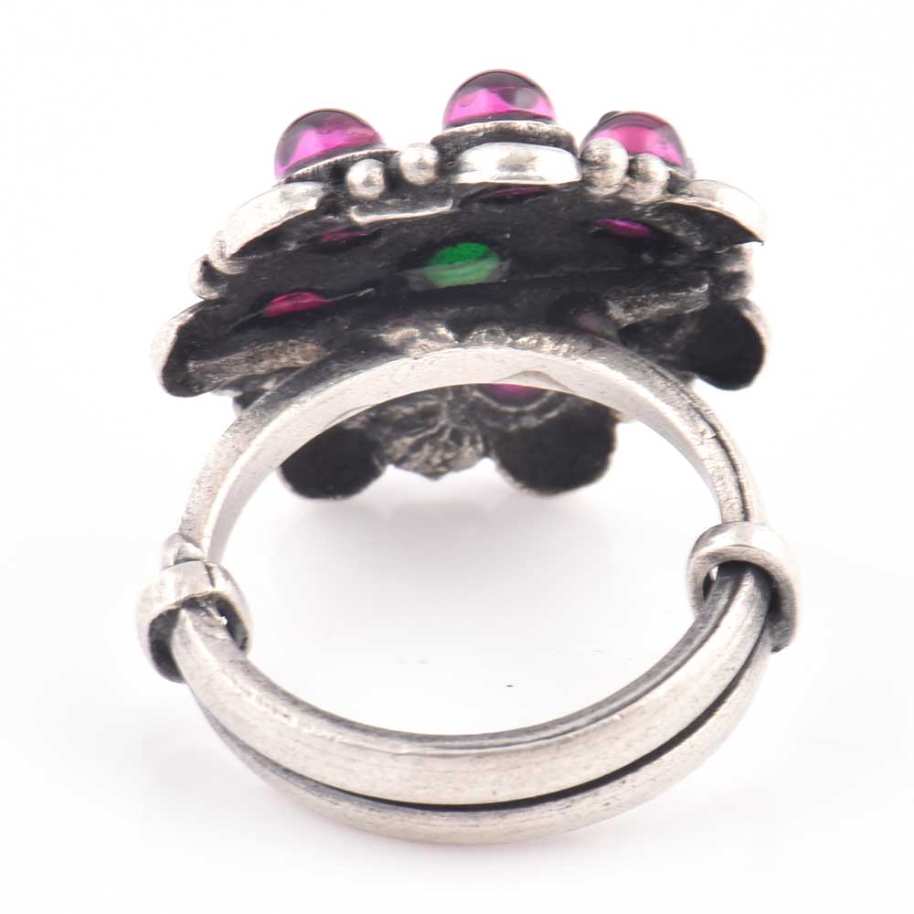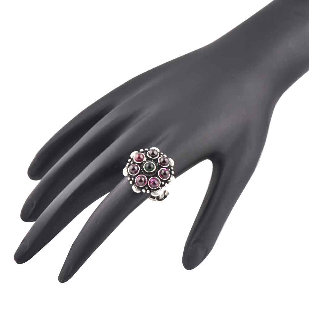 92.5 Sterling silver ring with amethyst stones with onyx stone in the centre is adjustable according to the size of the finger is the perfect statement jewelry that compliments any outfit traditional or modern. Young girls, sisters, girl friends and wives can team it with lehenga, salwar suit, sari or dress on Christmas, diwali or Christmas evenings.