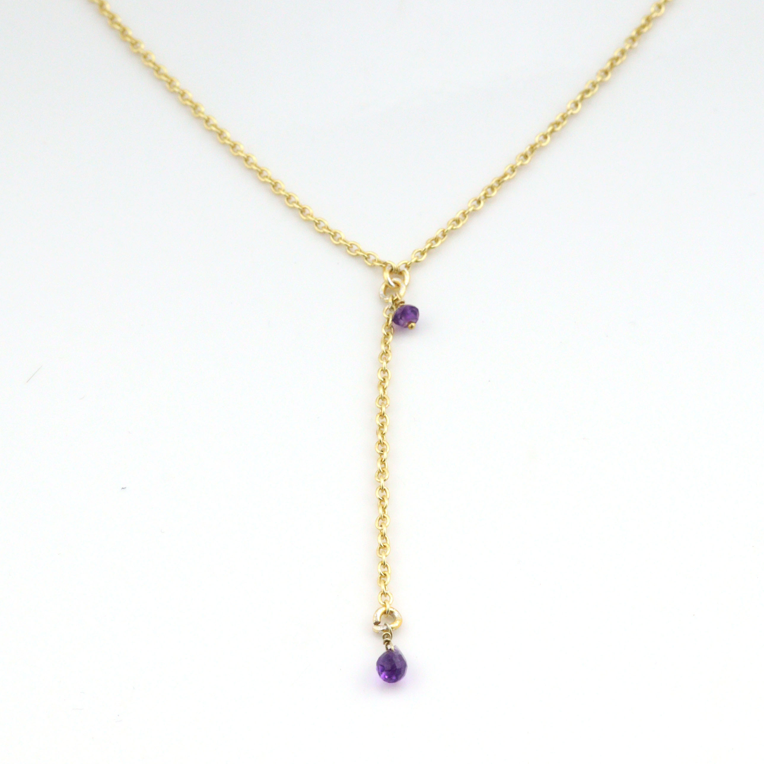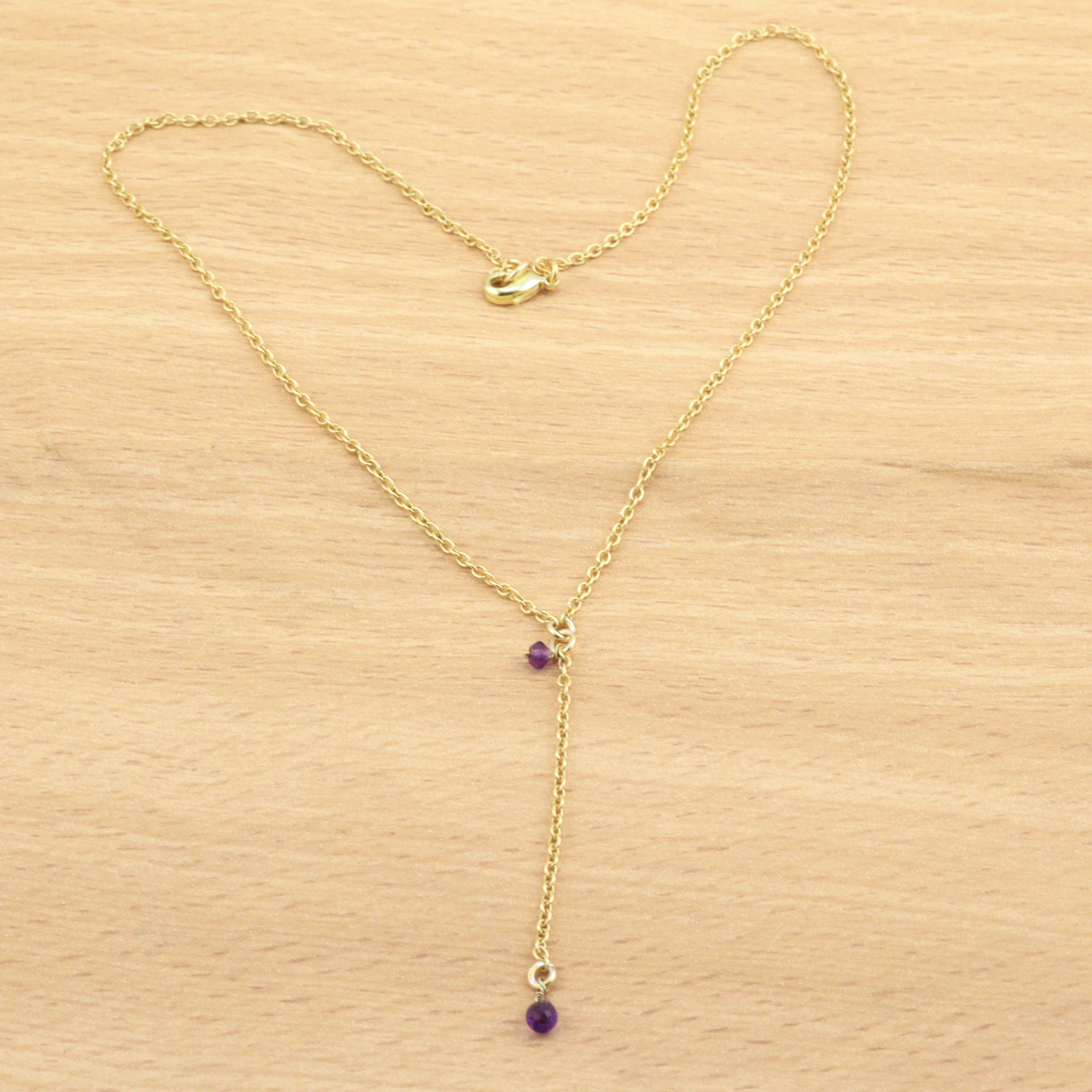 Keep the necklace dry and wipe gently with a soft cloth to preserve the amethyst’s shine and the bright gold-plated finish.