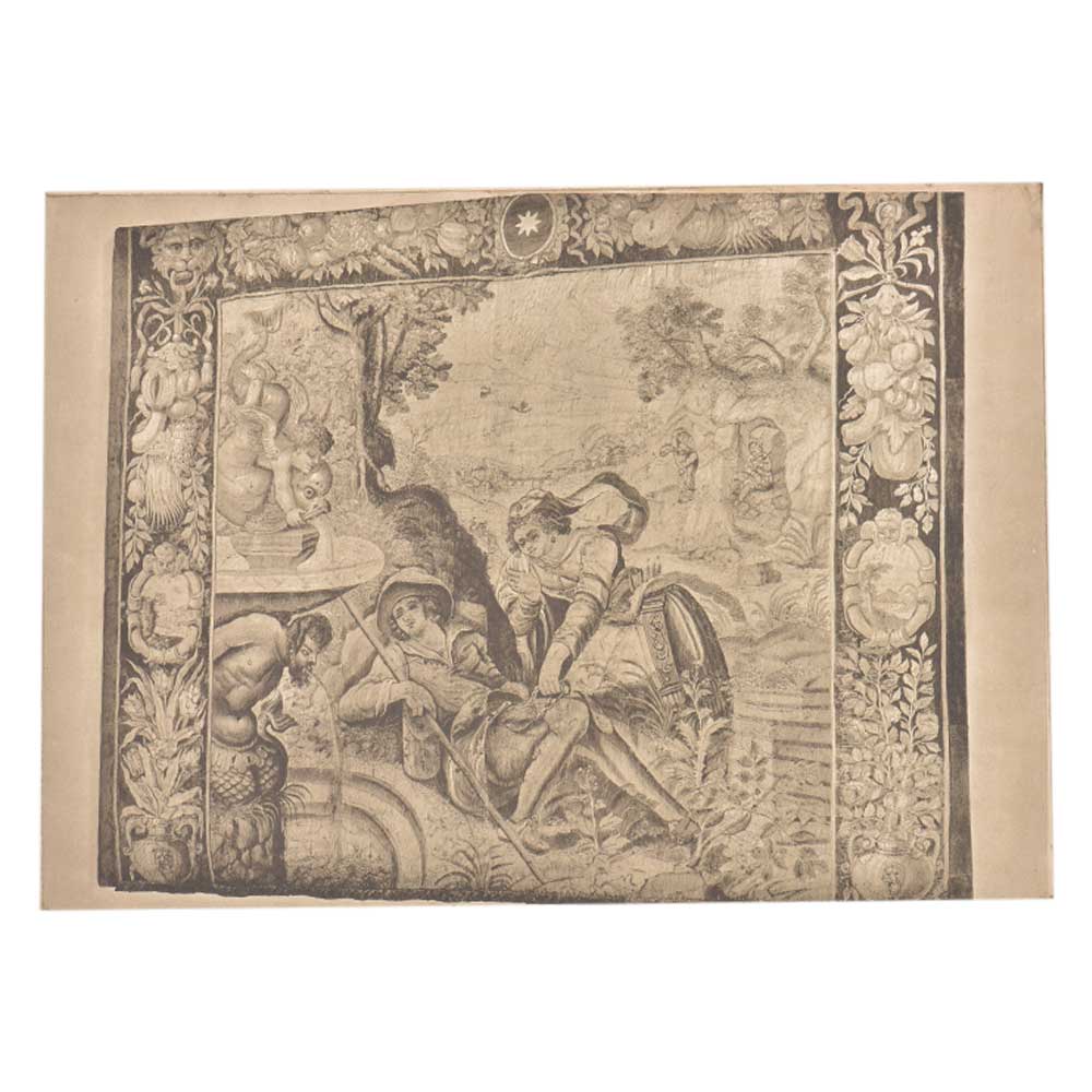 The picture presents a allegory of harmony and peace made with pen and brown ink with brown wash on paper . We see a traveller tired and probably injured with his beloved .In the background we see a water fountian of a half man half fish and cherubs on the pillar .It is a beautiful home decor product and a gifting option for friends and relatives