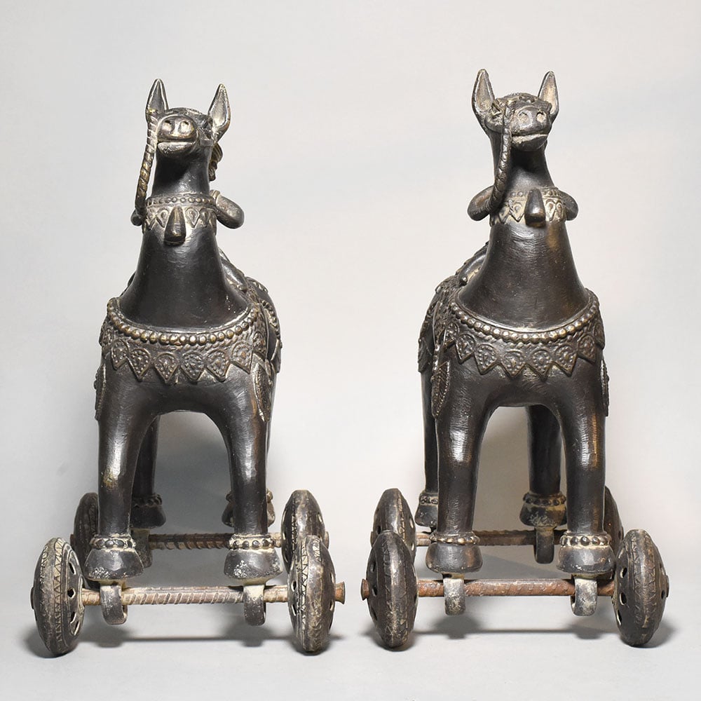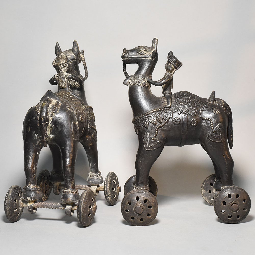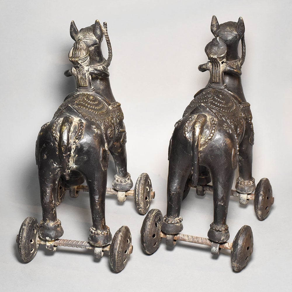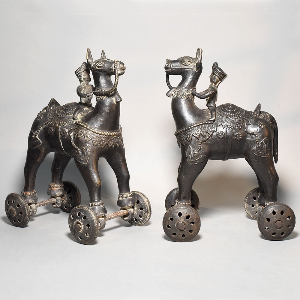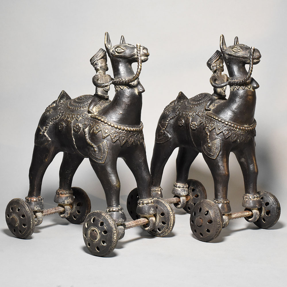 This pair of antique brass camel rider rolling toy figurines represents a charming example of traditional Indian folk metal artistry. Each piece features a stylized camel carrying a rider, mounted on a small wheeled base that allows the figure to roll smoothly when pushed. The design combines decorative sculpture with the playful functionality of traditional mechanical toys. The camels are crafted with elongated necks and upright posture, reflecting the distinctive form of desert caravans that have long been part of Indian and Central Asian trade culture. The riders sit confidently atop the animals, wearing traditional turbans and simple attire, suggesting scenes inspired by traveling merchants or caravan leaders. Intricate detailing across the camel bodies includes engraved saddle cloth patterns, ornamental collars, and decorative motifs that highlight the craftsmanship of rural metal artisans. The four small wheels attached beneath the legs are connected with metal axles, giving the figurines movement while maintaining their sculptural balance. The brass surfaces display a deep, aged patina that enhances the vintage character of the pieces. Natural wear and subtle tonal variations bring out the engraved details and contribute to their authentic antique appeal. Ideal for collectors of traditional folk toys, antique brass artifacts, or cultural dcor, this camel rider pair offers both historical charm and decorative uniqueness.