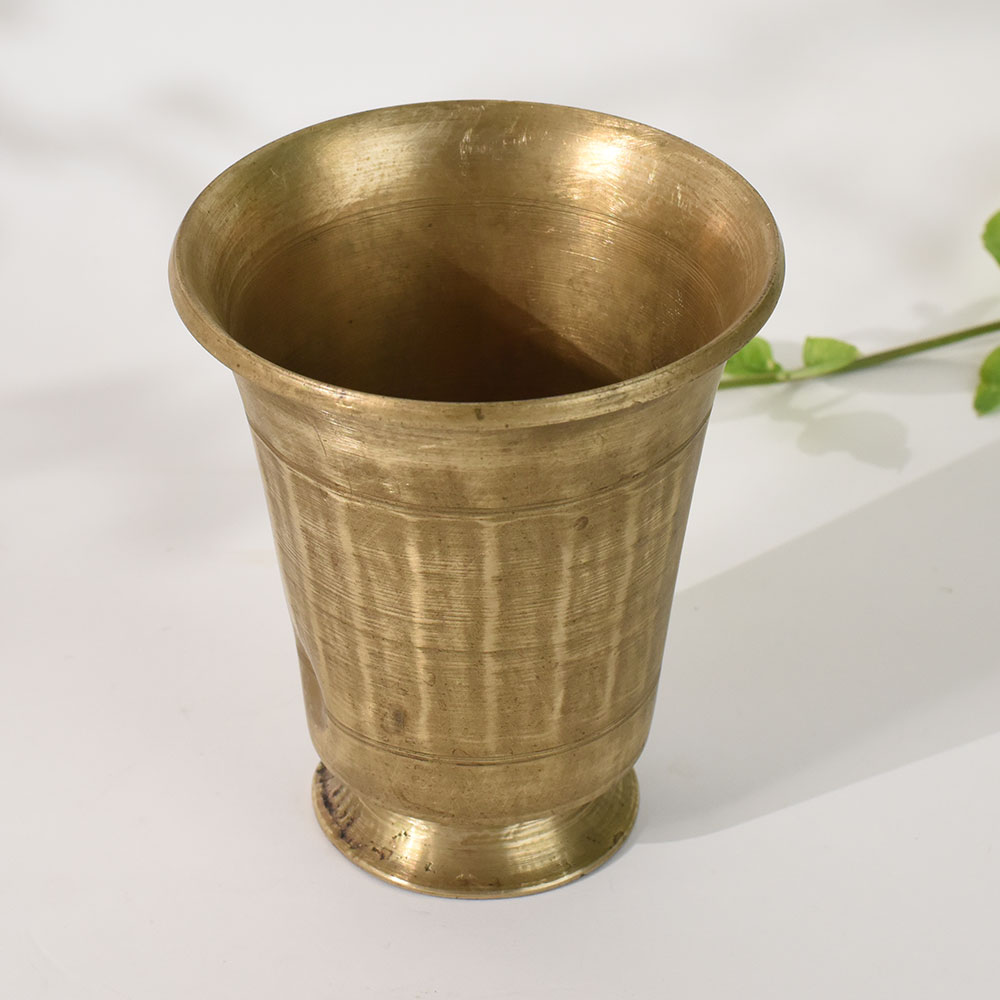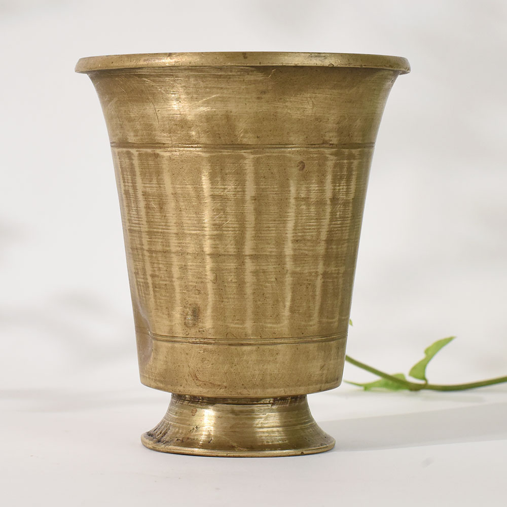 This vintage brass holy glass pot reflects the charm of timeless Indian craftsmanship, beautifully shaped by hand using traditional tools. With its tapered body, flared rim and sturdy circular base, it carries a rich devotional energy that makes it ideal for pooja rooms, home temples and ritual setups. The naturally aged brass surface displays authentic hammer textures and subtle patina, giving the vessel a true antique appeal. Perfect for holding holy water, tulsi leaves, sacred oils or ritual ingredients, this brass pot enhances the sanctity of your spiritual practices. Its classic form also makes it a charming decor accent, suitable for shelves, meditation corners and heritage-themed interiors. A meaningful collectible for lovers of vintage brassware, it adds cultural warmth and artistic authenticity to any space.