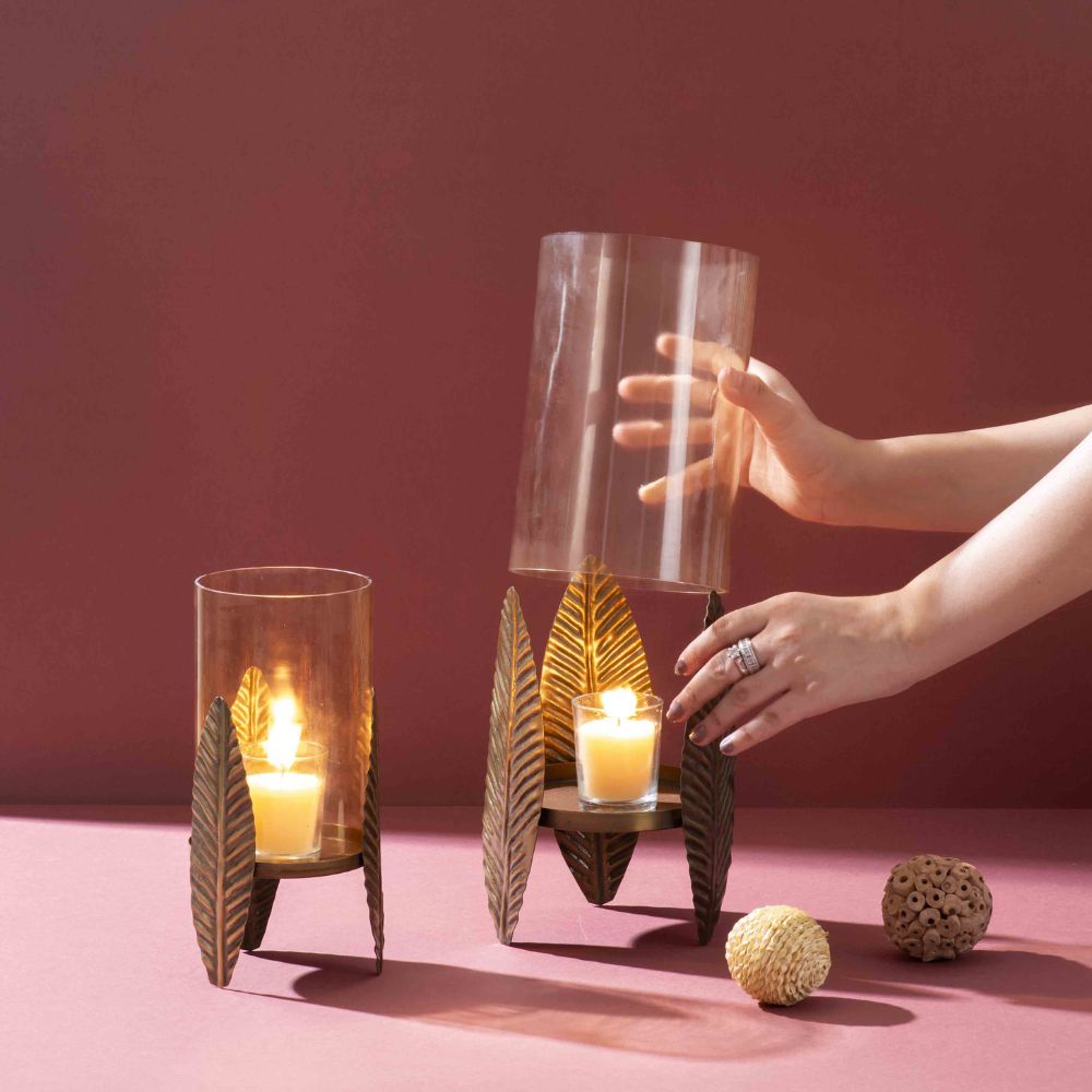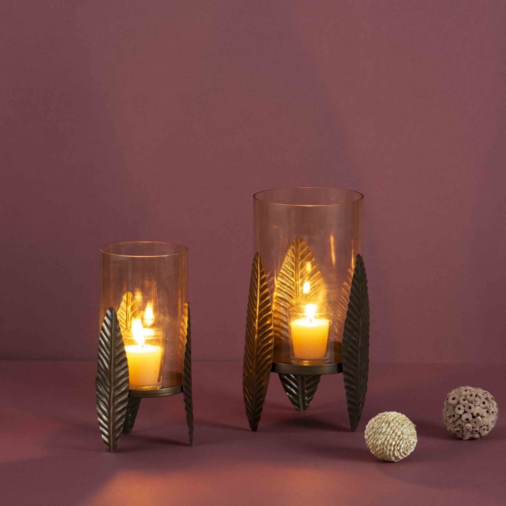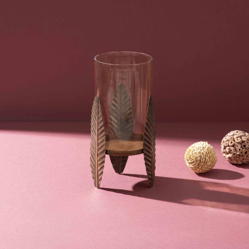 • Antique Brass Iron Candle Stand with Leaf Motif