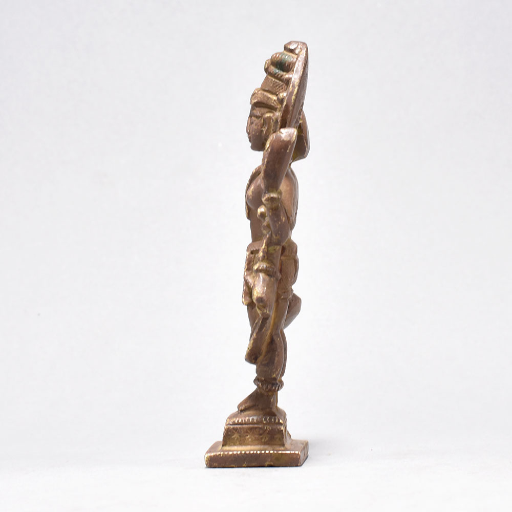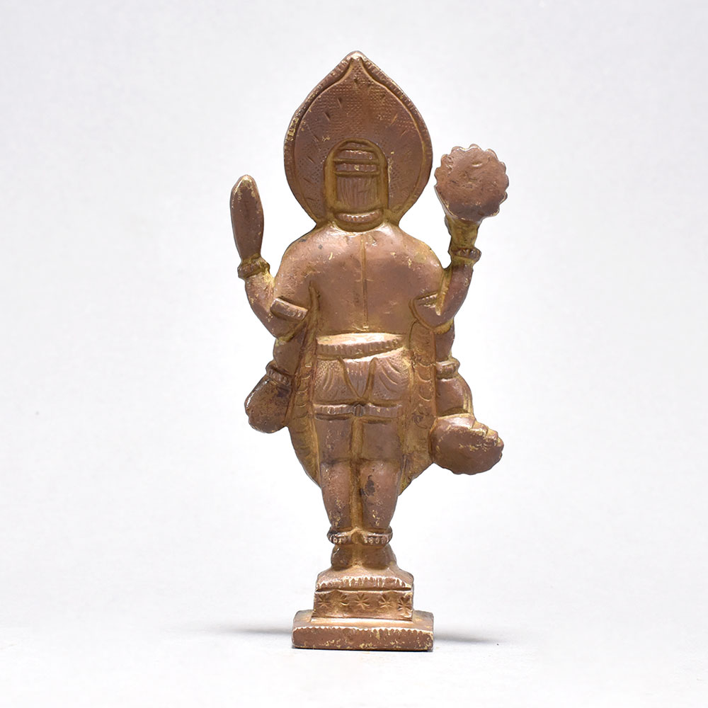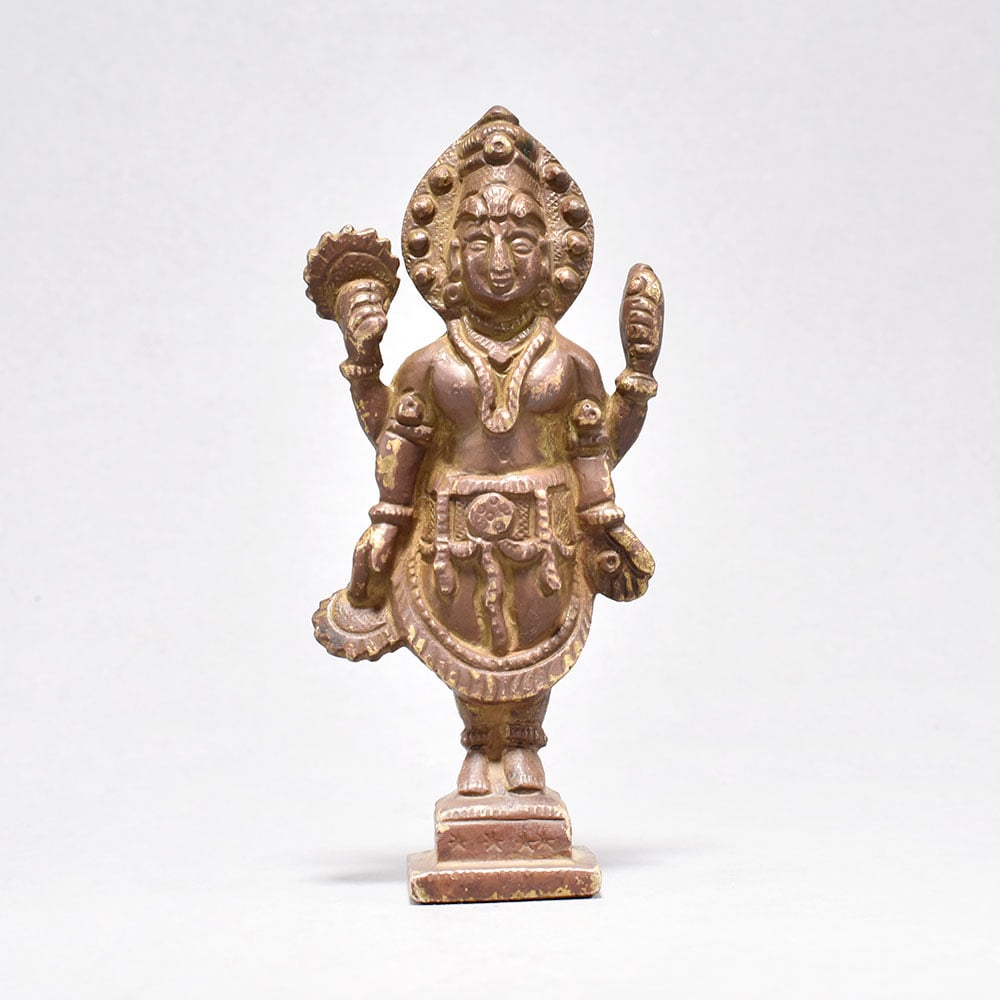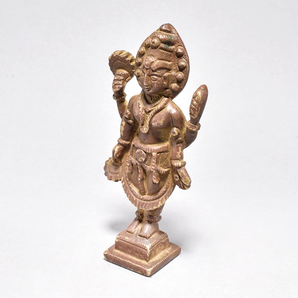 Bring the divine grace of Lord Vishnu into your home with this exquisitely crafted antique brass figure.Infuse your surroundings with the positive energy and protection of one of Hinduism's most revered deities. This antique brass Vishnu figure is a stunning work of art that will captivate and inspire all who behold it. This piece is a must-have for devotees and art collectors alike, breathing life and meaning into your home or sacred space. Invite the blessings of Lord Vishnu to guide and uplift you every day. Finely detailed with four arms, each holding sacred symbols Expertly cast in brass from the renowned artistic traditions of South India Depicts Lord Vishnu standing gracefully on a rectangular base Elevates any space with its intricate, timeless beauty This unique handcrafted piece is a testament to traditional artistry, blending functionality with beauty and making it a treasured collectible for years to come.