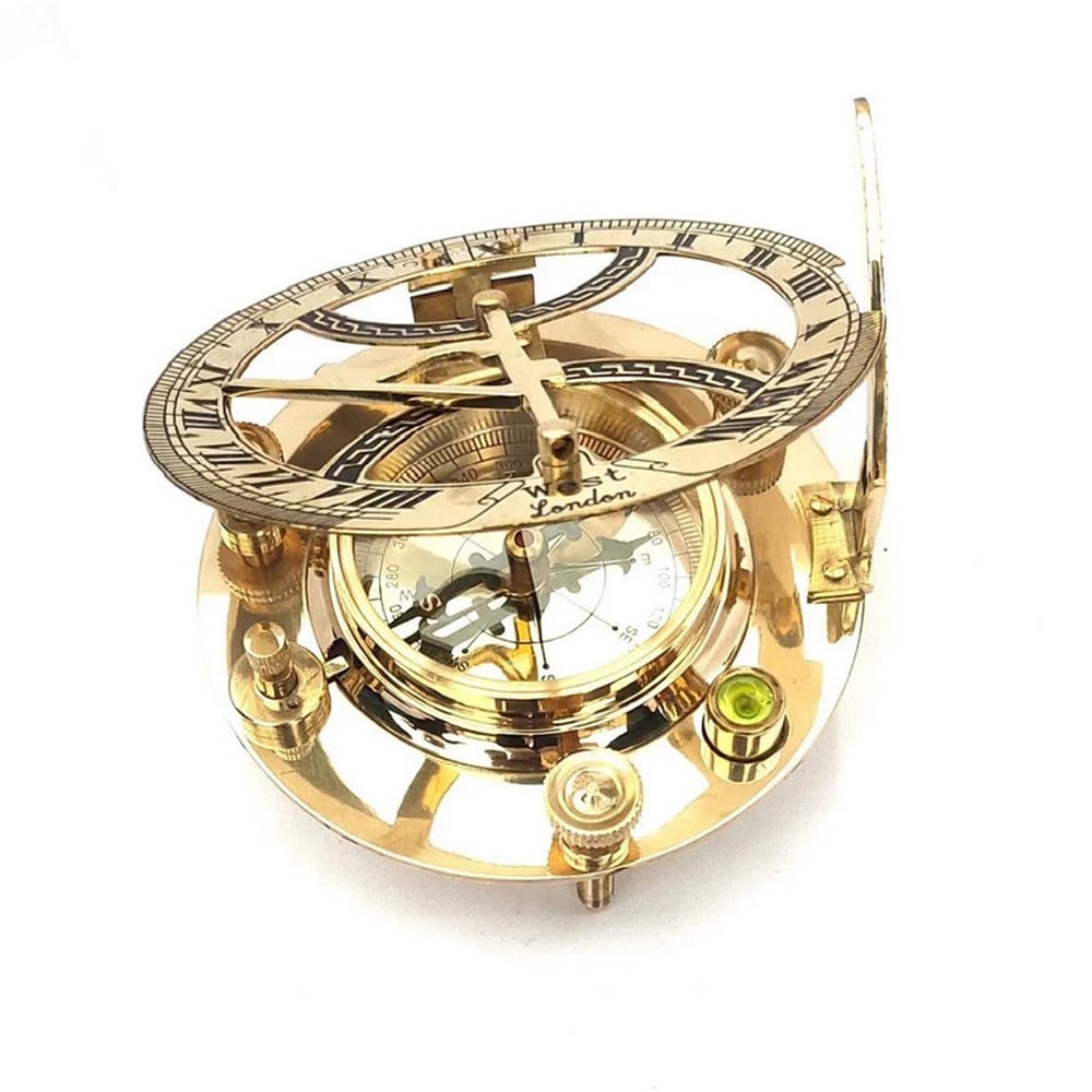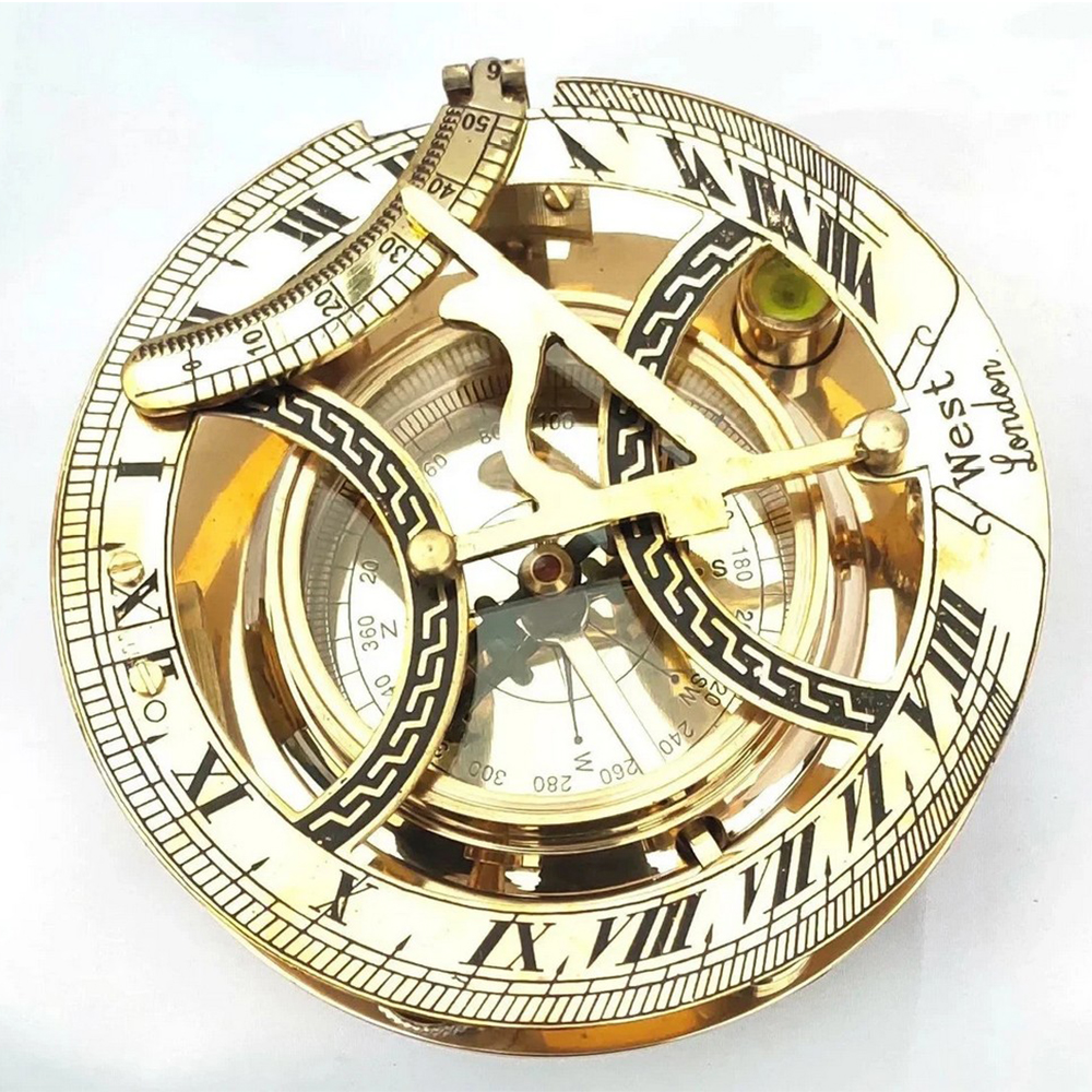 Introduce scientific heritage and old-world navigation artistry into your space with this antique brass sundial compass. Crafted from solid brass, this intricate instrument combines a traditional compass with a functional sundial, featuring engraved Roman numerals, directional markings, and precision-cut components. Its warm brass tone and complex mechanical form reflect the craftsmanship of early navigational tools once used for timekeeping and orientation.