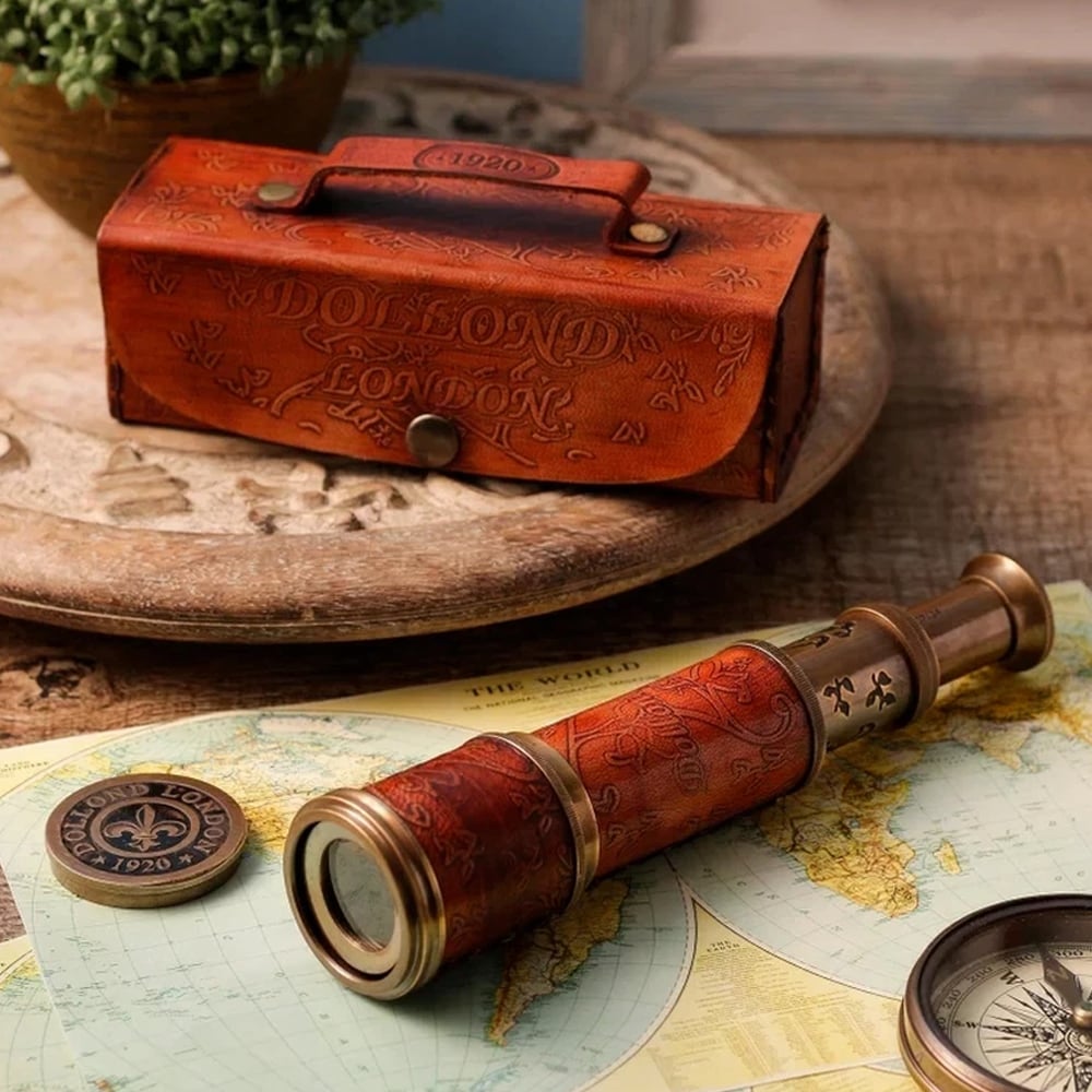 This antique brass telescope reflects old-world nautical charm, paired with a handcrafted leather case that enhances its authenticity and visual richness.