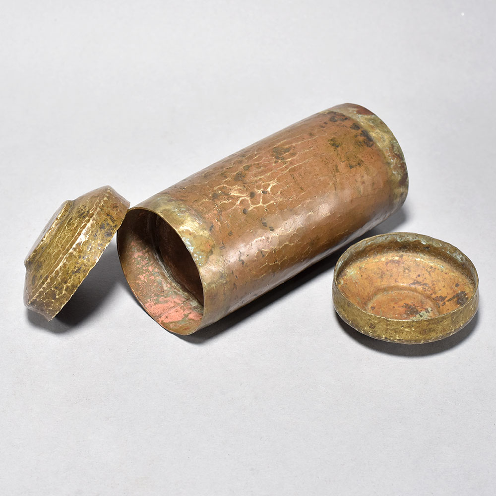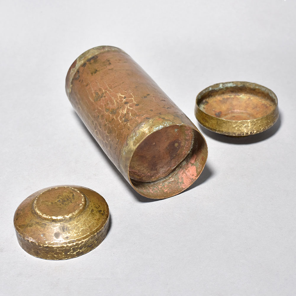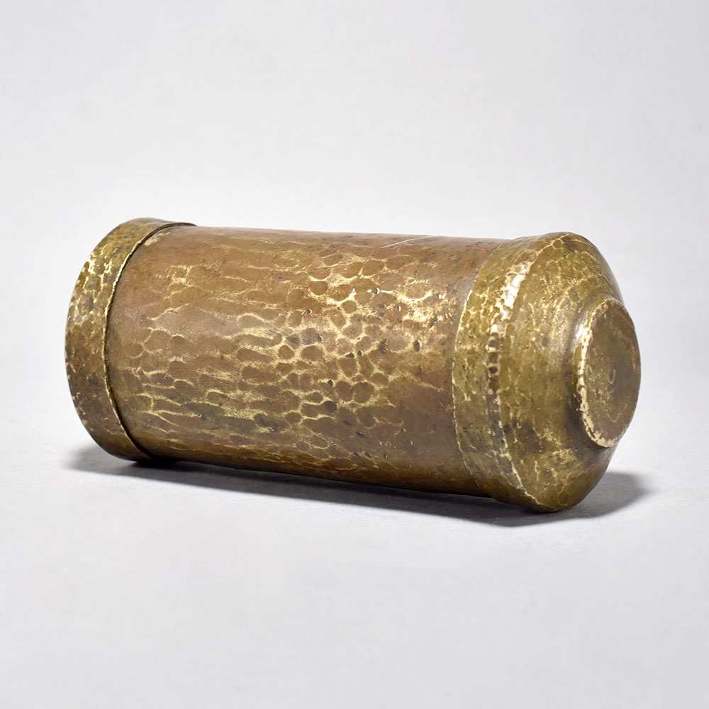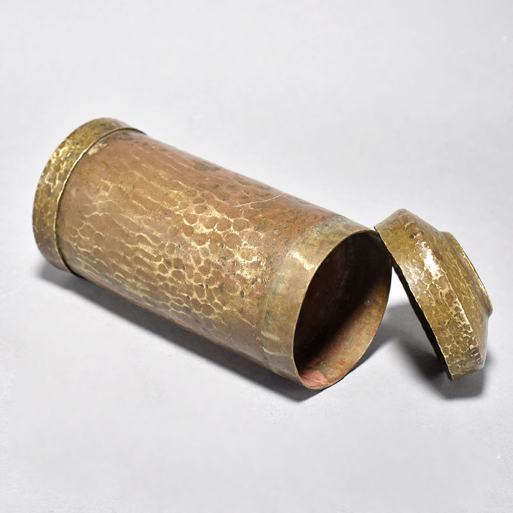 Uncover a captivating piece of history with the Antique Brass Tobacco and Lime Pot.This exquisite antique brass pot is a window into the past, revealing the customs and practices of a bygone age. Meticulously crafted by skilled artisans, this piece showcases the remarkable attention to detail and artistry that defined its era. Display it proudly in your home and let it spark wonder and curiosity about the rich history it represents. Whether you're a collector of antiques or simply appreciate fine craftsmanship, the Antique Brass Tobacco and Lime Pot is a must-have addition to your decor. Its timeless elegance and captivating design will captivate guests and elevate any space. Crafted from premium brass from central India Designed to hold tobacco and lime, popular oral hygiene and recreational substances of the past Cylindrical shape with intricate details and unique patterns showcase exceptional craftsmanship A fascinating conversation piece that transports you to a bygone era