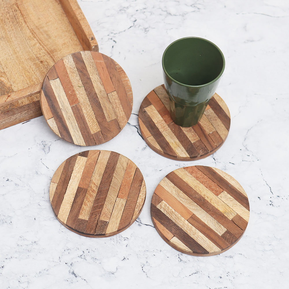 Buy a Pack of four handmade wooden tea coasters online from our website which is handcrafted by highly skilled and experienced Indian artisans. Made from high-quality wood, these coasters boast a circular shape and come in various shades of brown, lending them an enchanting antique finish. These coasters not only serve a practical purpose but also double as captivating decorative pieces for your home or office. Designed to hold water, tea, juice, or coffee glasses, these wooden tea coasters are perfect for use in any setting, be it at home, office, restaurant, hotel, or cafe. By placing these coasters under your beverage glasses, you can effortlessly prevent stains on your surfaces, keeping them pristine for longer periods. Each coaster is carefully constructed with attention to detail, ensuring a smooth and durable surface. These exquisite coasters also make for exceptional gifts on special or festive occasions. Showcasing the rich craftsmanship and traditional artistry of Indian artisans, this wooden tea coaster set is a thoughtful present for your loved fours.