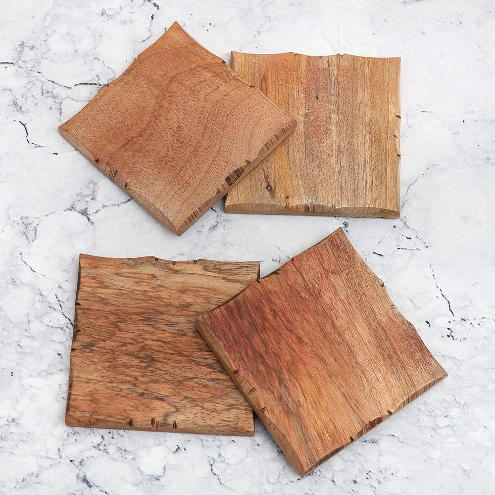 A square wooden coaster in a Pack of 4 which are handcrafted by skilled artisans from India using the finest quality wood. These coasters exude elegance and charm with their antique brown finish, making them not just functional but also a striking decorative piece for your home or office. Each coaster is a work of art, showcasing the artisan\'s attention to detail and commitment to excellence. The high-quality wood used ensures durability and longevity, allowing you to enjoy these coasters for years to come. Versatile in nature, these coasters are designed to hold water, tea, juice, or coffee glasses, protecting your surfaces from unsightly stains. Whether used at home, office, restaurant, hotel, or café, these coasters add a touch of sophistication to any setting. Furthermore, these coaster sets make perfect gifts for your loved fours on special or festive occasions, reflecting your thoughtfulness and appreciation for their aesthetic sensibilities.