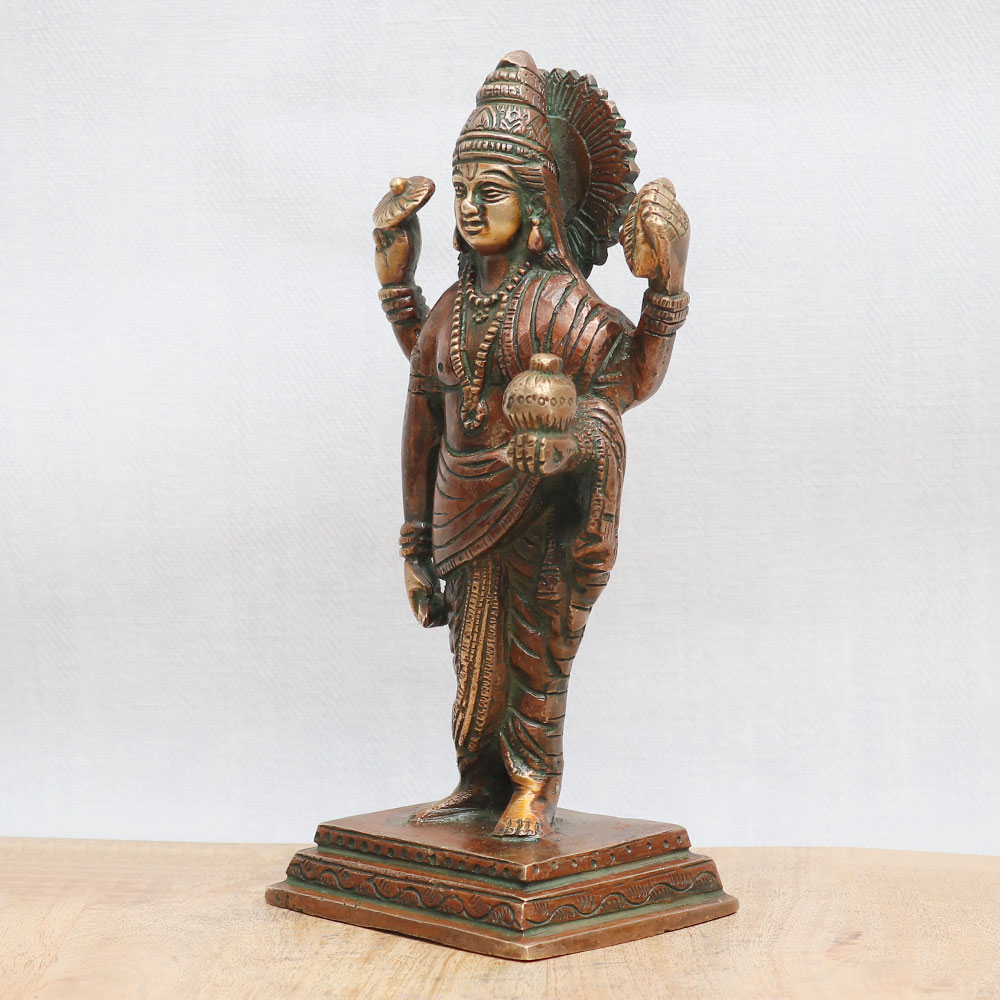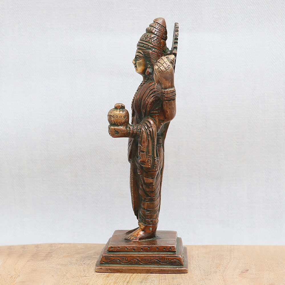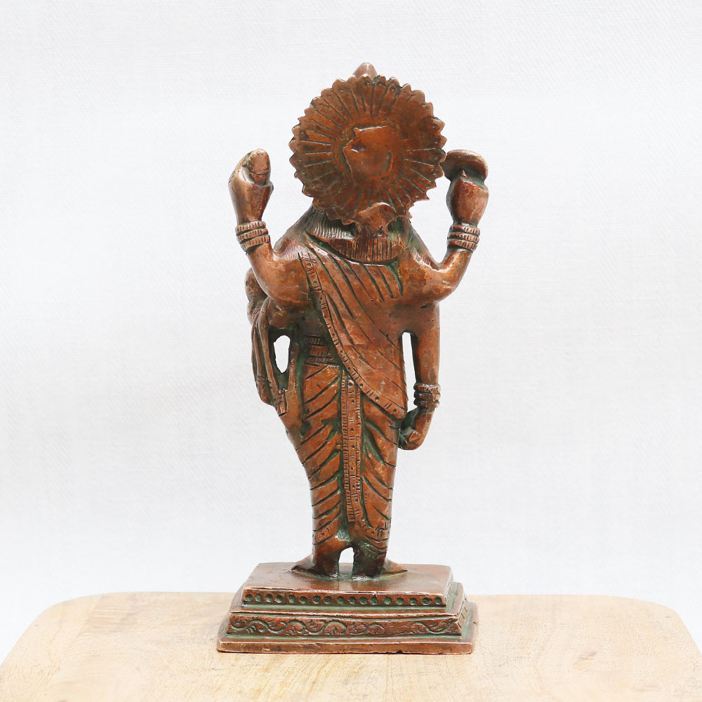 Buy a bronze murti of Lord Dhanvantari who is the revered physician of the devas in Hinduism and an esteemed avatar of Lord Vishnu. This god sculpture boasts a stunning antique brown finish, showcasing the intricate craftsmanship and attention to detail. Handmade by skilled Indian artisans using high-quality bronze, this murti adds an aesthetic touch to any interior decoration, radiating divine grace. Worshipped in numerous temples, this idol of god holds great significance in Hindu rituals and can be placed in your personal temple for worship. Additionally, it serves as a magnificent decorative piece for your home, office, cafe, restaurant, gym, or hotel temple. The presence of this captivating statue creates an aura of spirituality and tranquillity. Furthermore, this bronze murti makes for an auspicious gift on special, festive, or auspicious occasions. With the convenience of purchasing idols online, you can now embrace the divine energy of Lord Dhanvantari and elevate the ambiance of your sacred space.