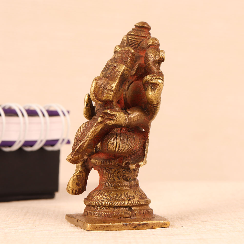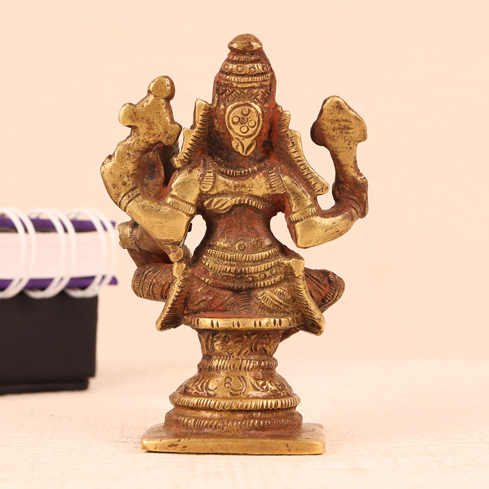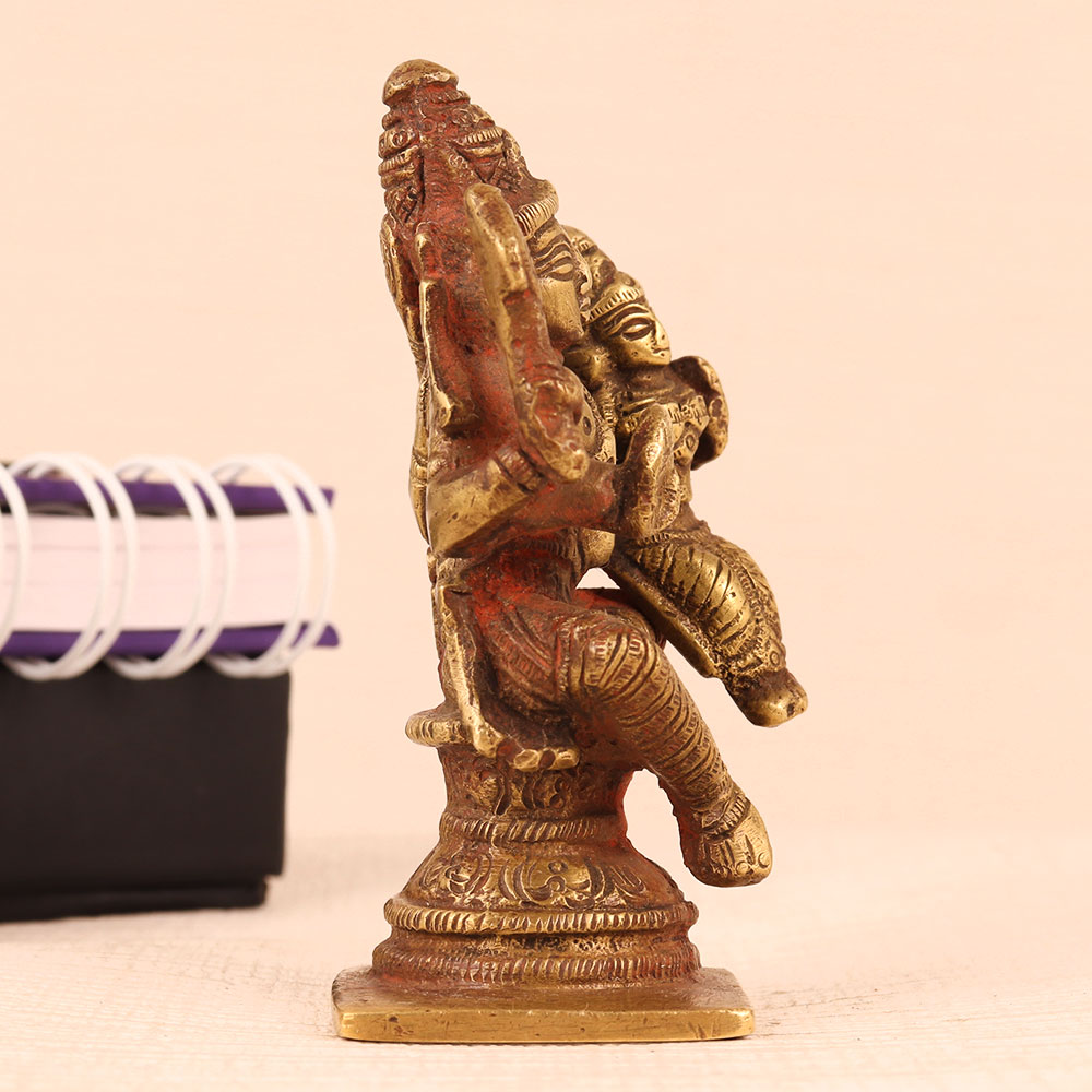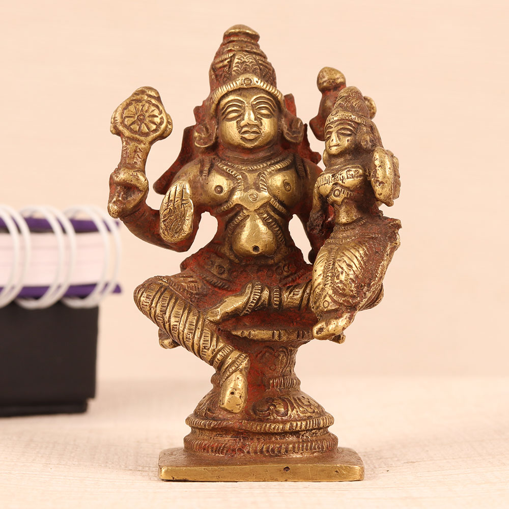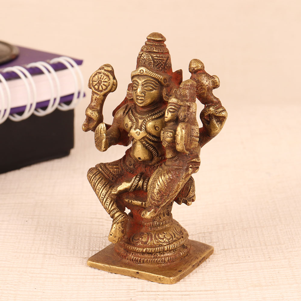 Experience the divine essence of Hindu mythology with our exquisite brass statue of Lord Vishnu and Goddess Lakshmi, a masterpiece of artistry and spirituality. Crafted by highly skilled Indian artisans, this awe-inspiring statue captures the essence of devotion in every intricate detail. Lord Vishnu, the preserver of the universe, sits majestically on a platform, while the Goddess of wealth and prosperity, Lakshmi, graces his left lap. The antique brown finish adds a timeless charm, making it an ideal addition to your sacred space, whether at home, in your office, restaurant, hotel, cafe, or shop's prayer room. This handcrafted masterpiece not only serves as an object of worship but also doubles as a captivating decoration. Its elegance and craftsmanship make it a cherished item for collectors of vintage art. Moreover, this stunning brass statue serves as a heart-warming gift for your loved ones on special, festive, or auspicious occasions. It carries with it the blessings of Lord Vishnu and the abundance of Goddess Lakshmi, making it a thoughtful and meaningful gesture for weddings, housewarmings, or religious celebrations.