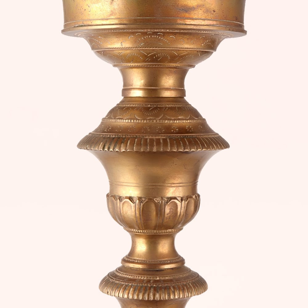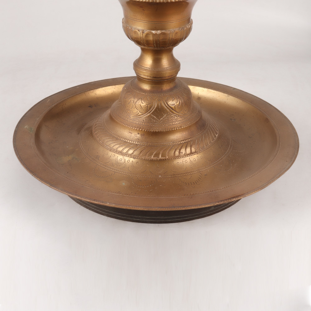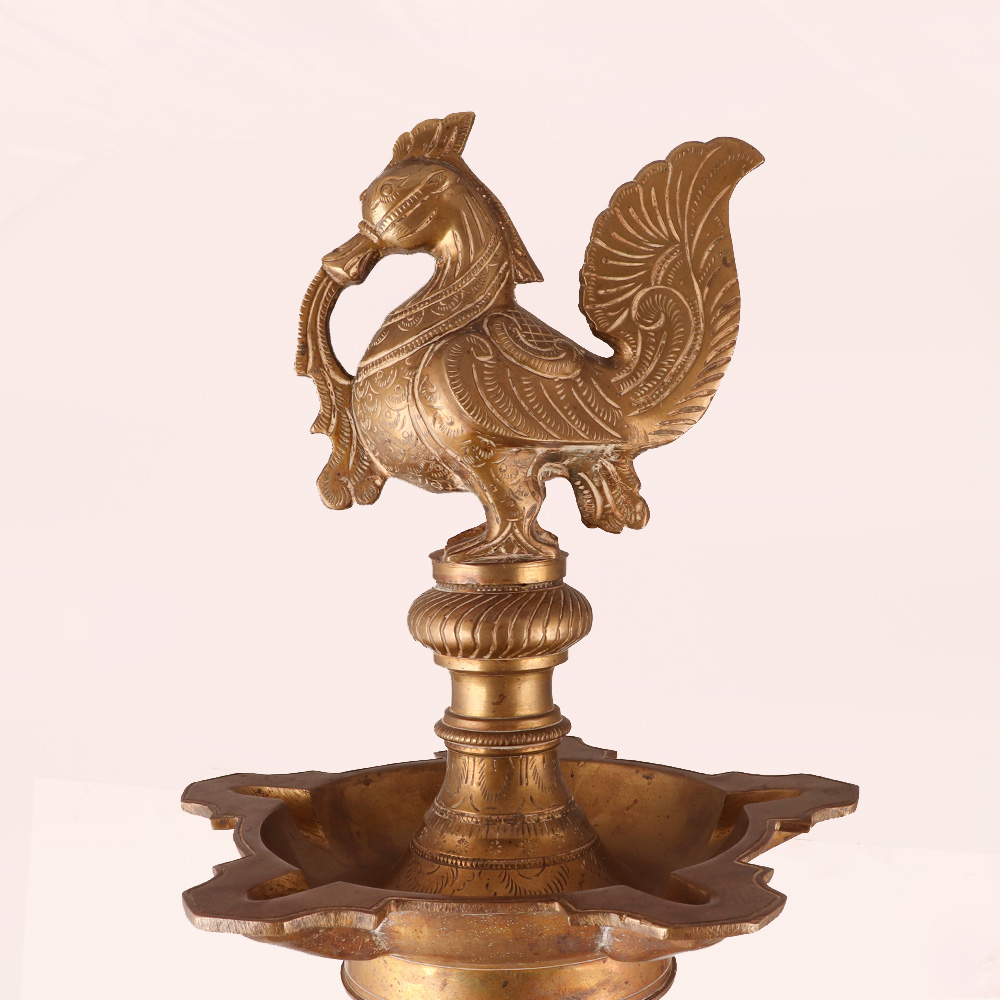 Buy a Brass Peacock Oil Lamp online that is a true testament to the artistry and craftsmanship of talented Indian artisans. This elegant masterpiece boasts a captivating peacock engraving adorning its crown, evoking a sense of beauty and grace. The lamp's antique brown finish exudes a timeless charm, accentuating the intricate details of the brass work. Crafted from premium-quality brass, this oil lamp is a symbol of durability and longevity. Its sturdy appearance, along with its beautiful engravings, adds an air of sophistication to any setting. Light up your space with the warm glow of tradition by illuminating up to five jyots using mustard oil or ghee with cotton wicks. Perfect for spiritual moments, the Brass Peacock Oil Lamp serves as an ideal aarti companion during prayers. Additionally, it doubles as a striking decor piece, elevating the ambiance of homes, offices, restaurants, hotels, or cafes during special occasions. Looking for a thoughtful gift? Look no further. This lamp makes for a heartfelt present for your loved ones on festive or special occasions.