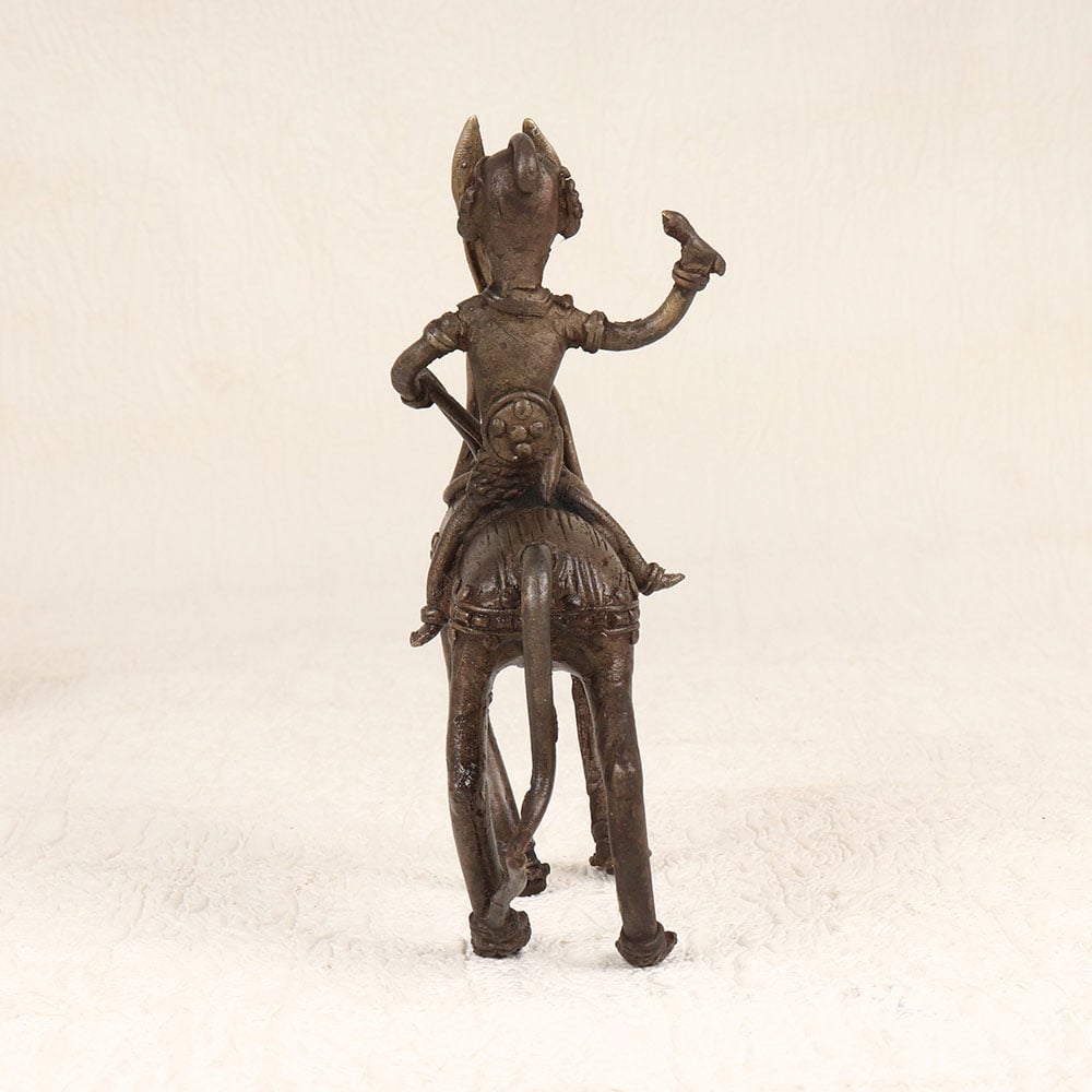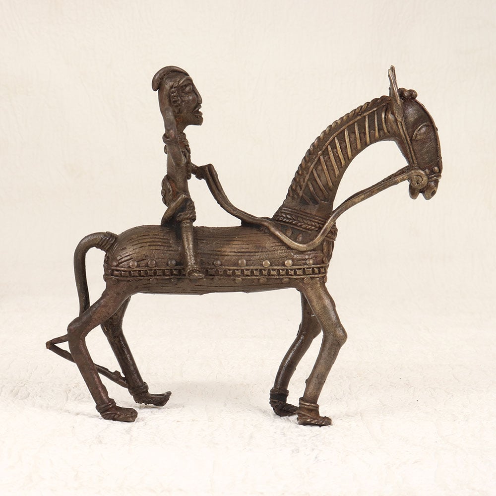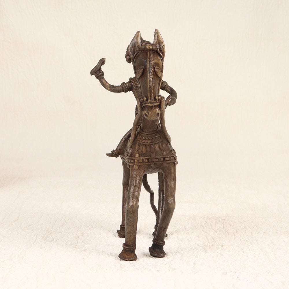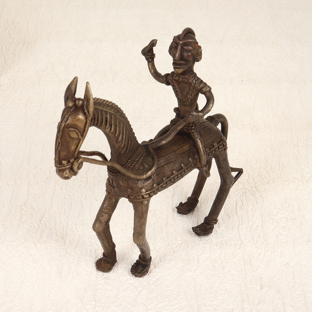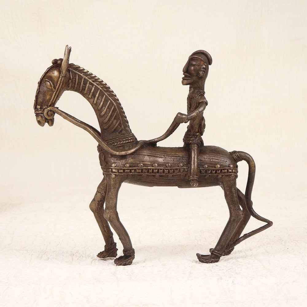 Enhance your decor with the timeless charm of this vintage brass horse with rider that is intricately crafted in tribal art style. Handmade by talented Indian artisans from Bengal, this exquisite piece showcases their mastery in brass craftsmanship. The antique brown finish adds a touch of nostalgia, enhancing the allure of this unique creation. Meticulously designed, the horse and rider exude a sense of cultural richness, making it a versatile addition to any space. Whether adorning your home, office, restaurant, hotel, or cafe, this piece effortlessly enhances the aesthetic appeal of its surroundings. It’s warm, antique brown hue imparts a sense of history, making it a perfect fit for vintage collections. This artistic masterpiece isn't just a decor item; it's a thoughtful gift option. Delight your loved ones on special, festive, or auspicious occasions by presenting them with this handcrafted brass sculpture.