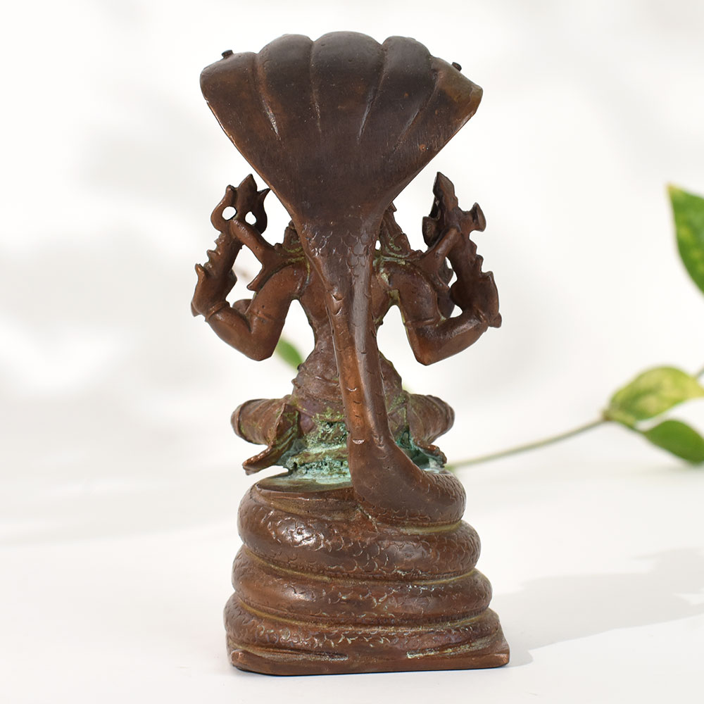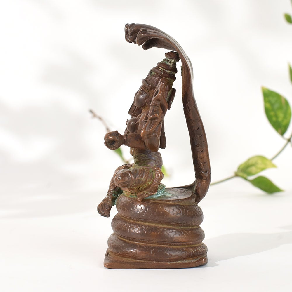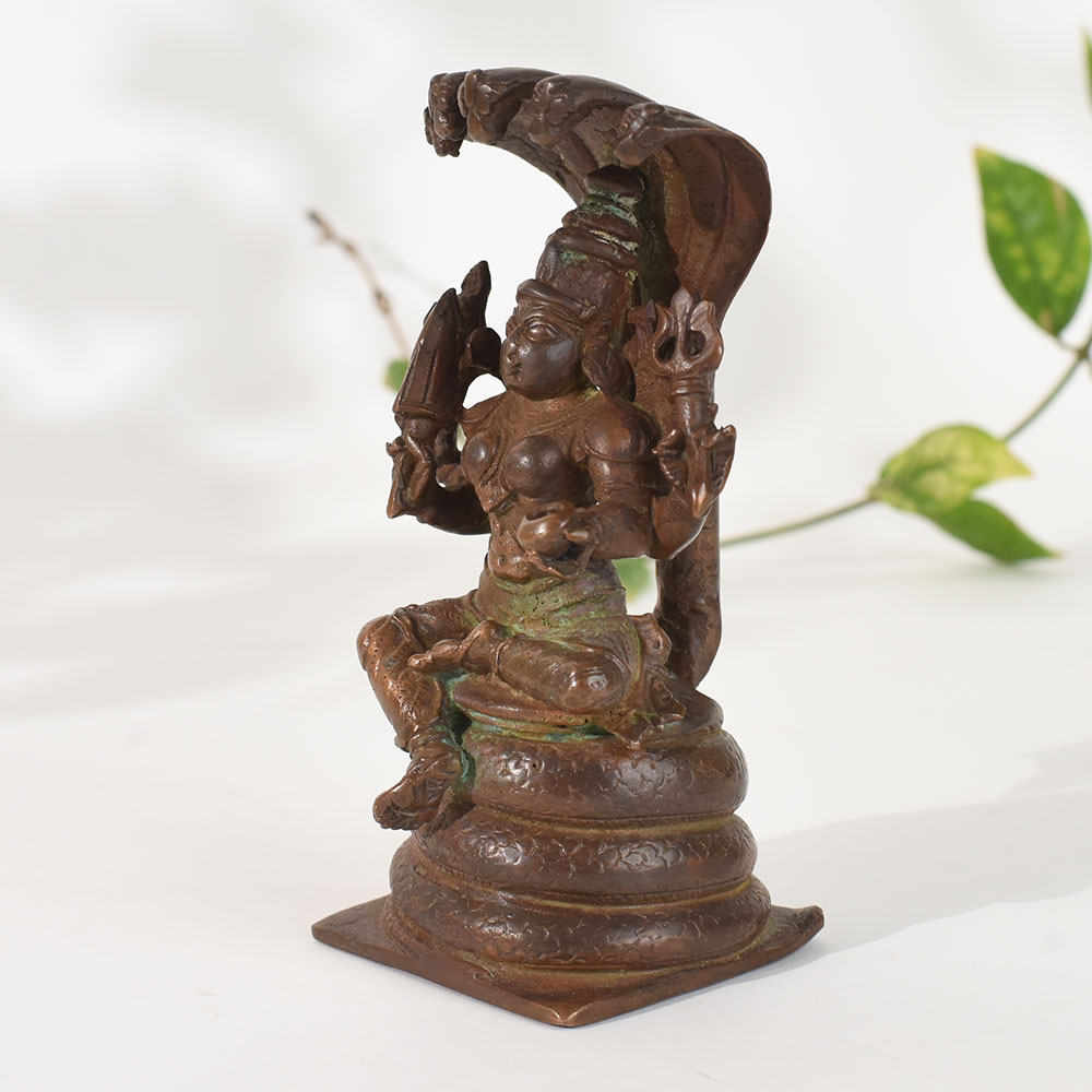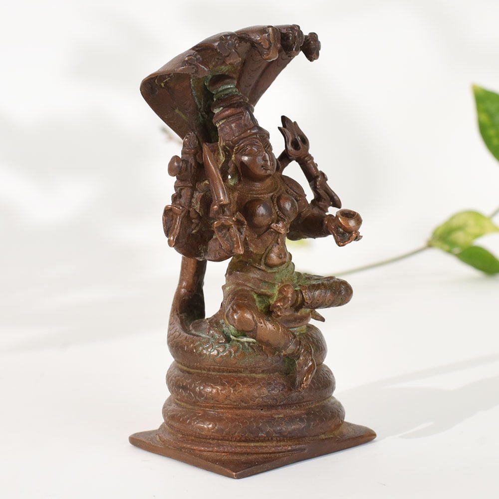 Celebrate the richness of South Indian heritage with this vintage copper goddess Mariammanstatue, meticulously crafted in traditional temple-style artistry. The goddess is depicted seated on a coiled serpent base with the protective multi-hooded naga canopy rising above her. This symbolic representation reflects divine strength, protection, and spiritual awakeninghallmarks of ancient South Indian iconography. Made from solid copper, the sculpture showcases an aged patina with naturally developed greenish tones, enhancing its antique charm and timeless character. The intricate detailing in the deitys ornaments, posture, and four-armed form reflects exceptional craftsmanship found in classical South Indian metal art traditions. Ideal for meditation rooms, home altars, heritage-themed decor setups, or spiritual corners, this statue radiates a strong divine presence. It also makes a meaningful collectible for lovers of vintage art, traditional sculptures, and Indian mythology. Whether displayed as decor or used in rituals, this piece adds depth, cultural symbolism, and spiritual serenity to any environment.