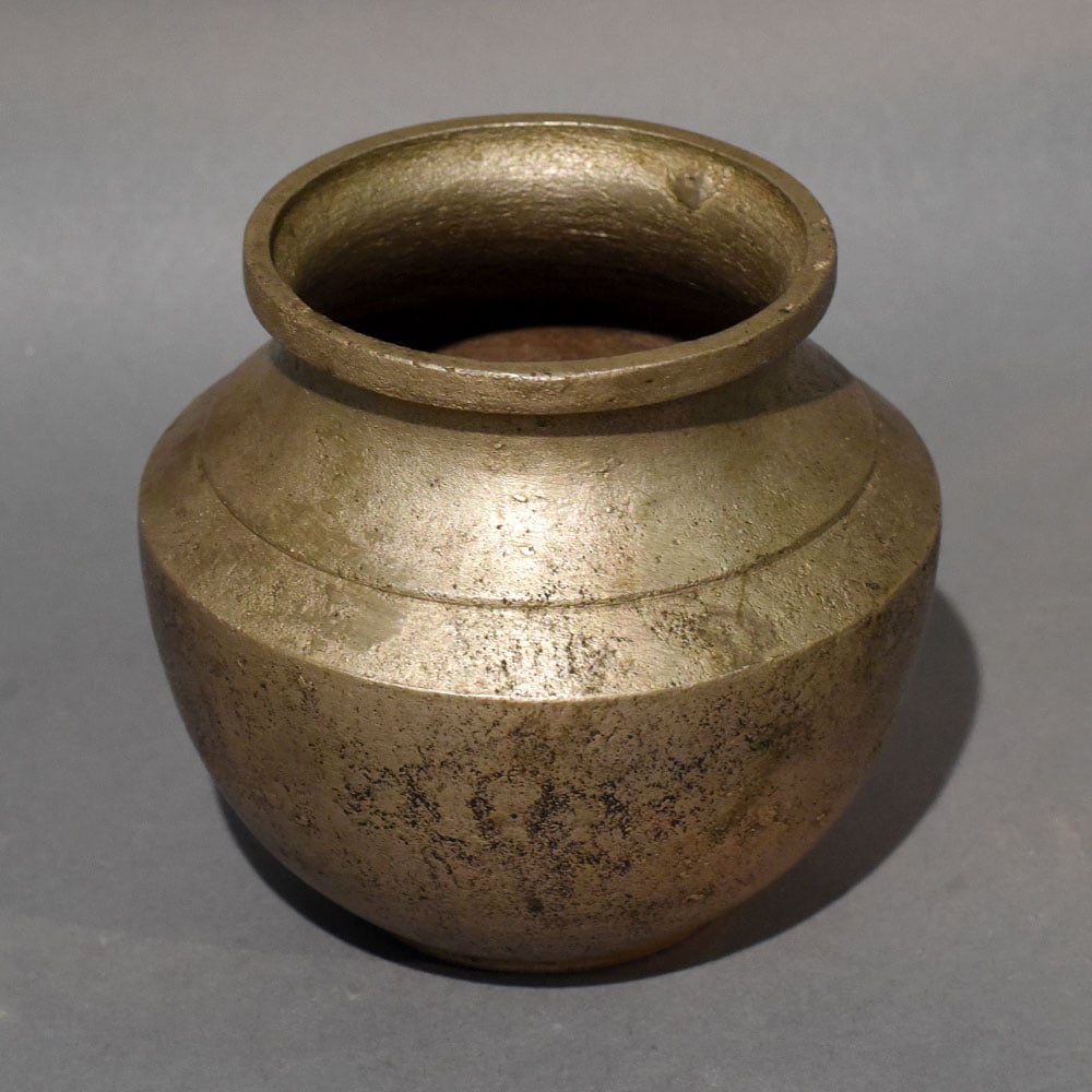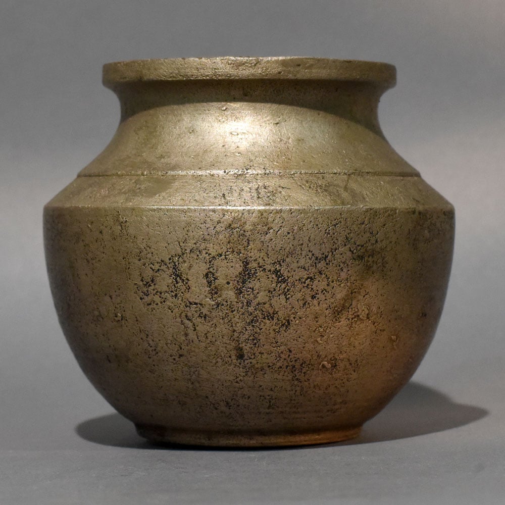 This antique finish brass kalash traditional pooja pot features a classic rounded body with a gently tapering neck and broad rim. Its balanced silhouette reflects traditional temple vessels used in sacred rituals and festive ceremonies. The wide opening allows easy filling, while the stable circular base ensures secure placement during worship. The surface carries a distinctive aged texture with natural patina and darkened speckled detailing across the lower half. These tonal variations enhance its antique appeal and highlight the authentic character of brass. The upper band and subtle ridge detailing create visual separation between the neck and body, adding structure to the rounded form. Traditionally used as a kalash in Hindu rituals, this vessel symbolizes abundance, purity, and divine energy. It can be filled with sacred water and topped with mango leaves and a coconut during ceremonies such as griha pravesh, weddings, Navratri, and daily pooja rituals. The rounded form represents fullness and prosperity, making it a meaningful addition to altar arrangements. Crafted from solid brass using traditional shaping techniques, this kalash is durable and designed for long-term devotional use. Over time, the brass develops a deeper tone, enhancing its heritage value. Each piece carries slight variations in surface texture, reflecting genuine craftsmanship and age-inspired finishing.