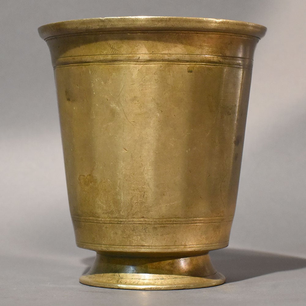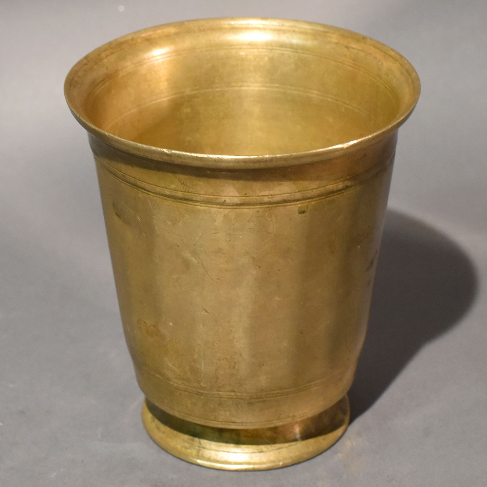 This antique finish brass pooja pedestal cup is crafted in a classic temple-inspired form that reflects ritual purity and traditional utility. The vessel features a wide outward-curving rim and a gently tapered cylindrical body, resting firmly on a rounded pedestal base. The balanced proportions give it a grounded yet elevated presence, ideal for sacred settings. The surface reveals natural patina, soft tonal variations, and faint handcrafted markings that enhance its authentic character. Fine linear band accents encircle the upper and lower body, introducing subtle detailing while preserving the clean and timeless silhouette. The aged brass finish carries a heritage appeal that deepens gracefully over time. Designed for ritual use, the smoothly finished interior is suitable for sacred water, milk, panchamrit, or other ceremonial offerings. Brass vessels are traditionally valued in Indian households and temples for their durability, symbolism, and long-lasting strength. This cup integrates seamlessly into daily pooja rituals, festive observances, and altar arrangements. The sturdy pedestal base elevates the vessel slightly, giving it ceremonial importance while ensuring stable placement. Solid brass construction supports extended use and maintains structural integrity. Each piece carries slight natural variations in tone and texture, reinforcing its handcrafted individuality.