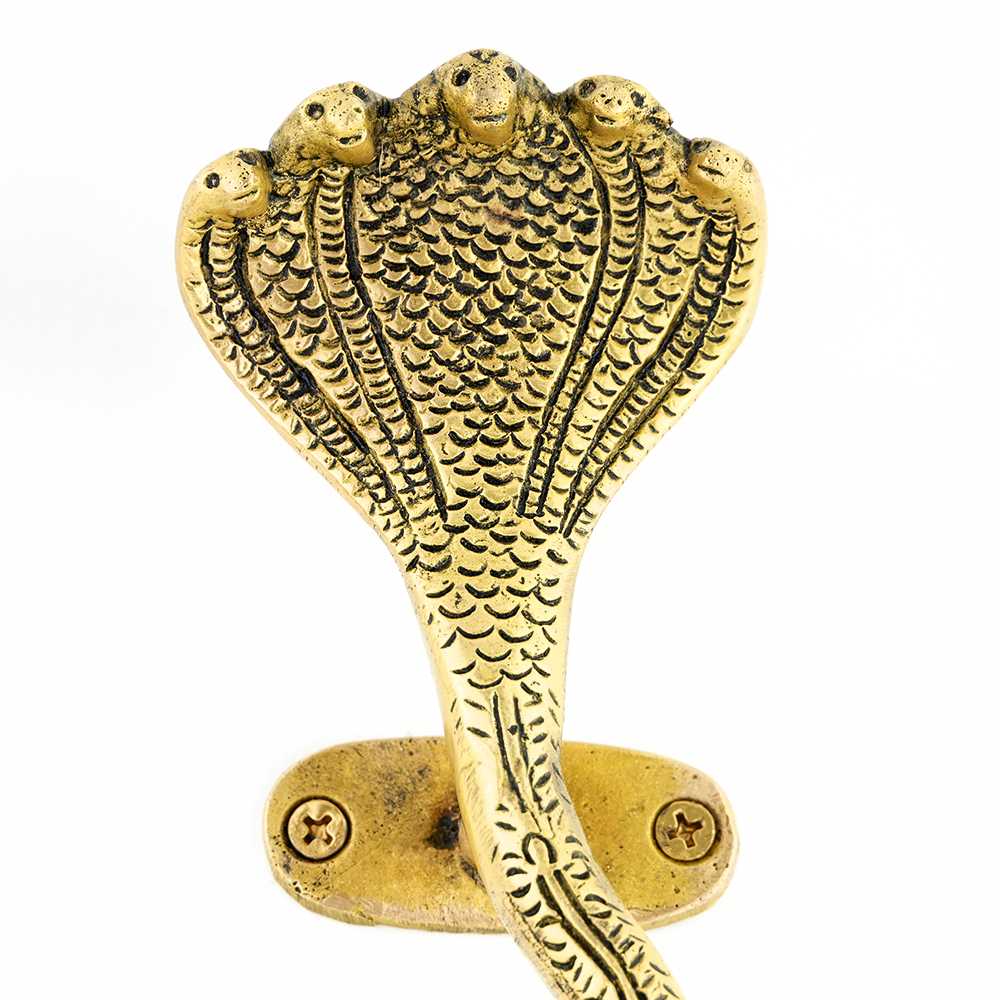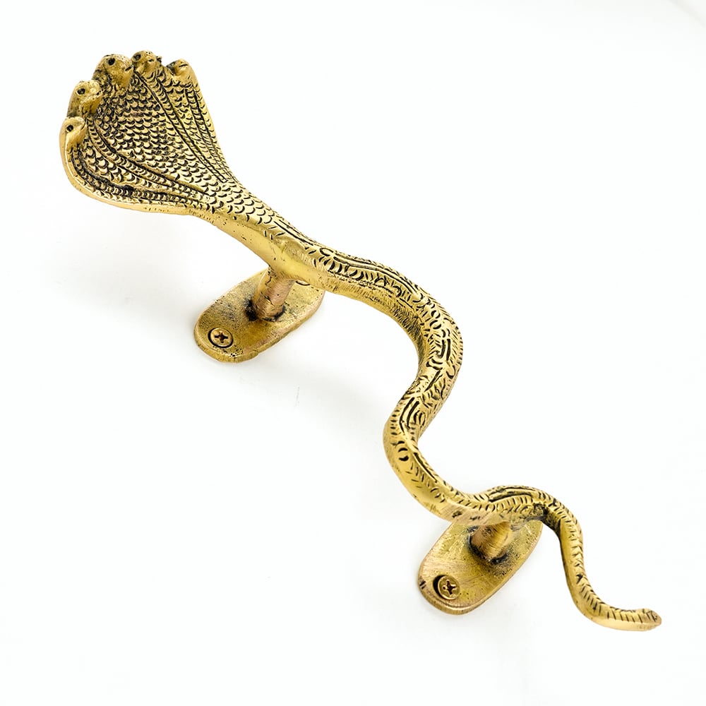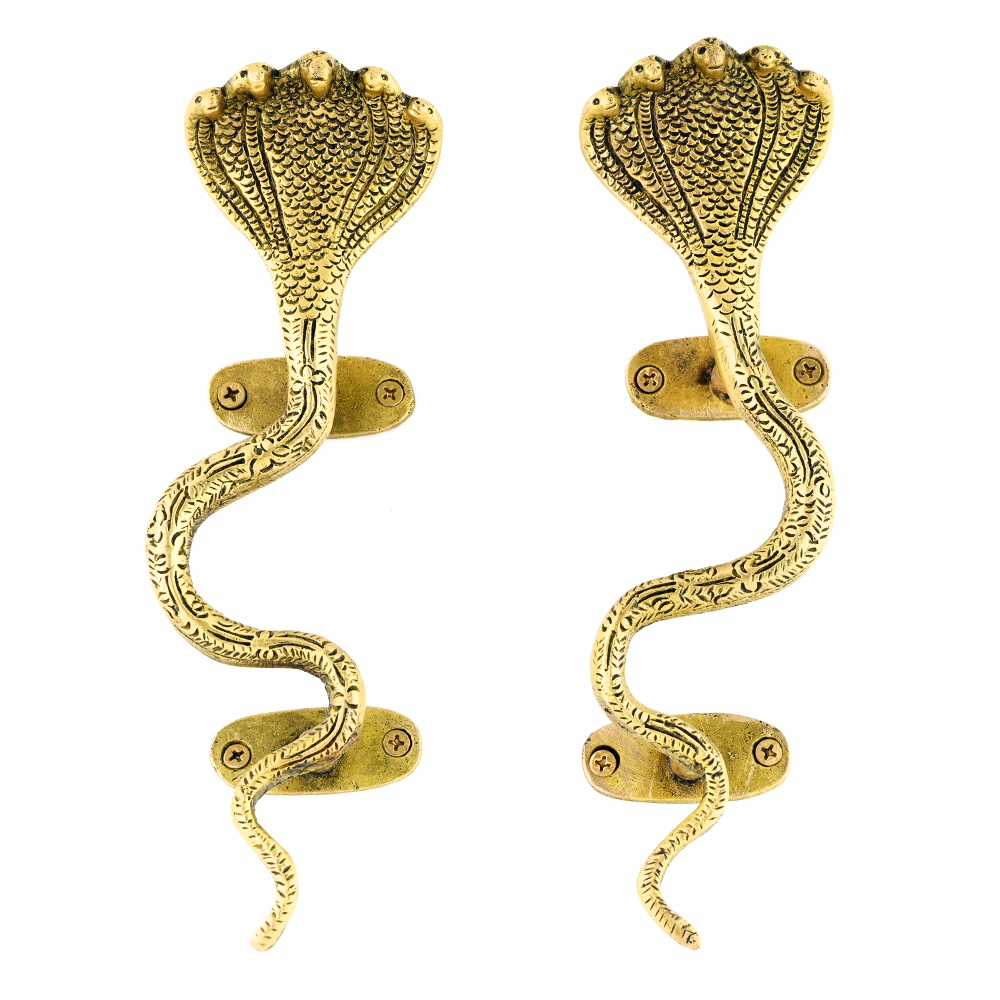Add a bold traditional accent to your doors with this exquisite cobra-inspired brass door handle Set of 2. Expertly handcrafted from solid brass, this handle features a detailed multi-hooded cobra head with a gracefully curved snake body, symbolizing protection and strength. The antique golden finish enhances its vintage appeal while highlighting the fine hand-engraved textures. Designed for durability and visual impact, this brass handle is ideal for main doors, temple doors, wardrobes, cabinets, or heritage interiors. Easy to install and built to last, it blends functional use with artistic craftsmanship, making it a standout dcor hardware piece for classic and ethnic spaces.