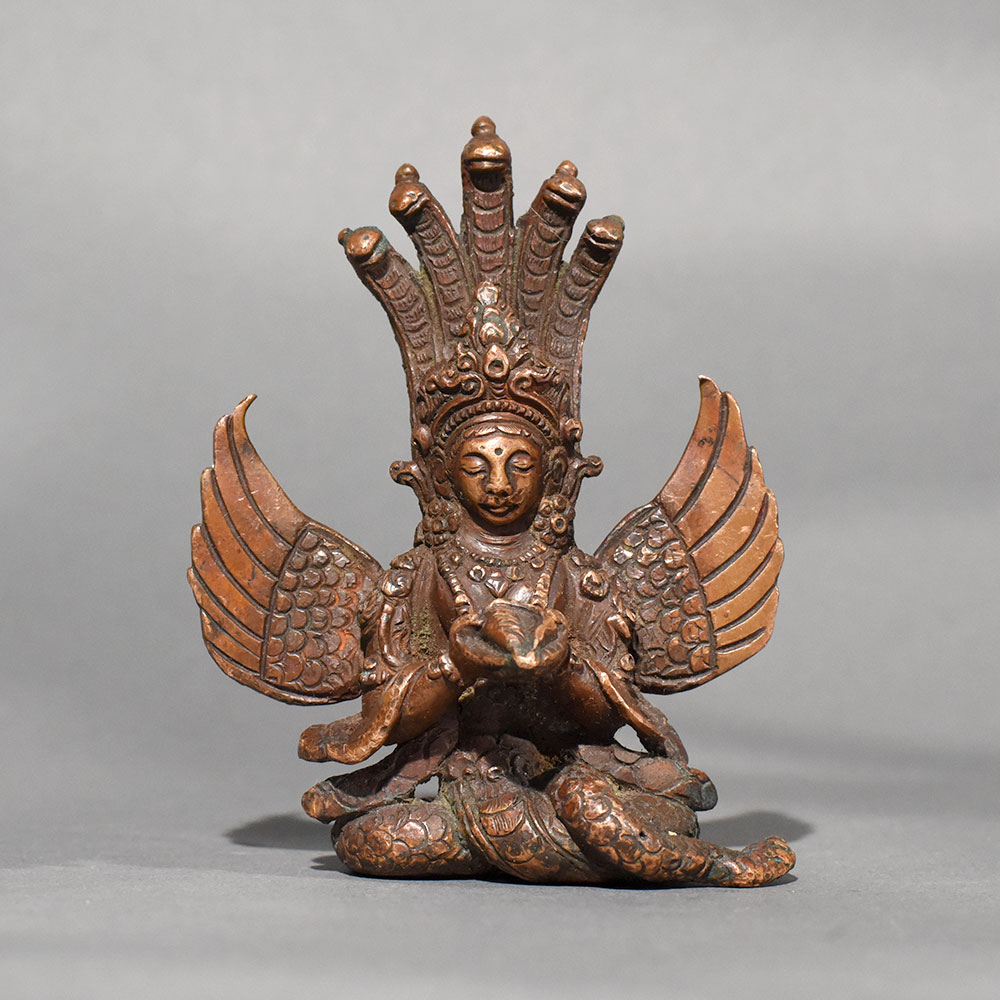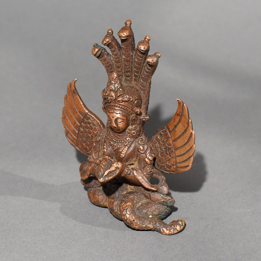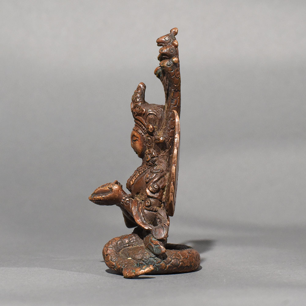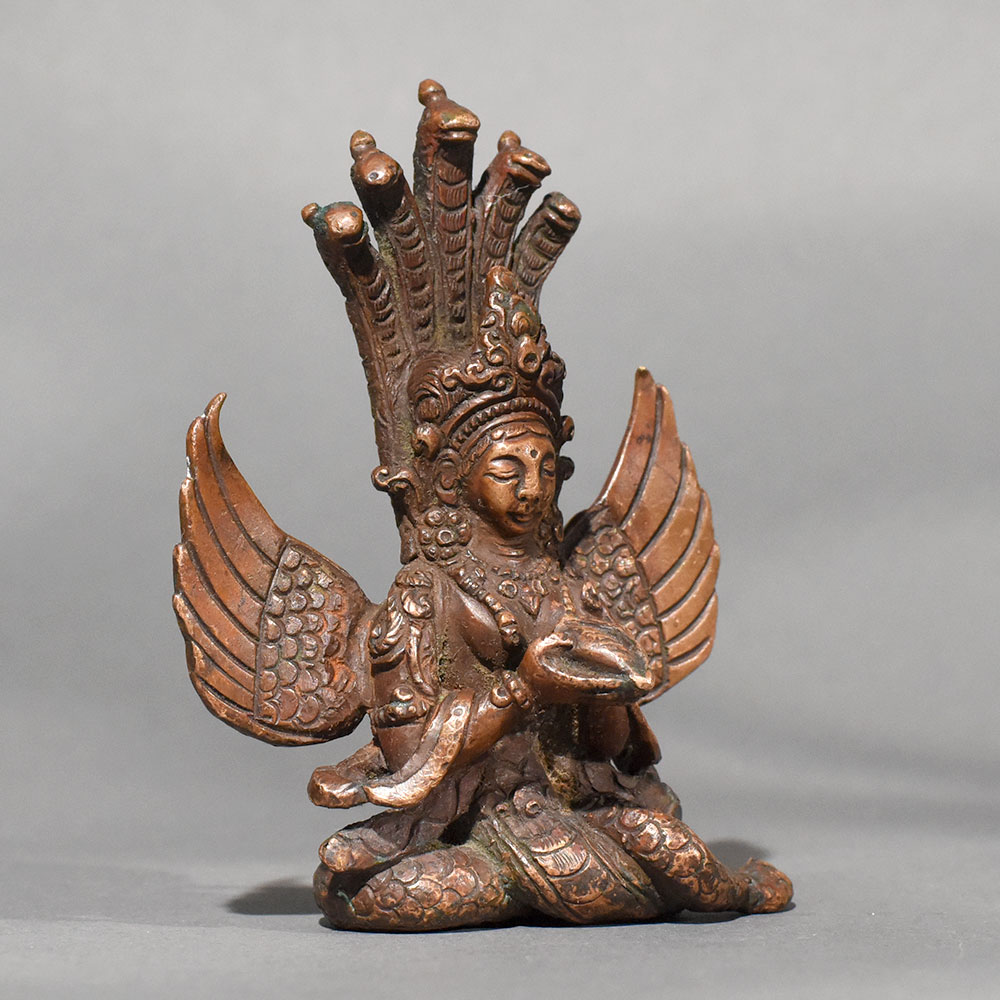 This vintage copper Naga Kanya statue is a powerful representation of protection, divine femininity, and ancient spiritual symbolism. Handcrafted by skilled artisans, the sculpture depicts the mythical serpent maiden seated gracefully, crowned with multiple serpent hoods and detailed wings that symbolize guardianship and transcendence. The solid copper construction features a naturally aged patina, giving the statue an authentic antique character and timeless appeal. Intricate detailing is visible across the facial expressions, jewelry, serpent scales, and flowing form, highlighting traditional metalworking techniques passed down through generations. The balanced posture and symmetrical composition make this statue a striking focal point for pooja rooms, meditation spaces, heritage interiors, or curated dcor displays. In many traditions, Naga Kanya is associated with fertility, protection, and cosmic balance, making this piece both spiritually meaningful and visually captivating. Whether placed in a sacred setting or showcased as a collectors artifact, this vintage copper statue adds depth, history, and soulful artistry to any environment.
