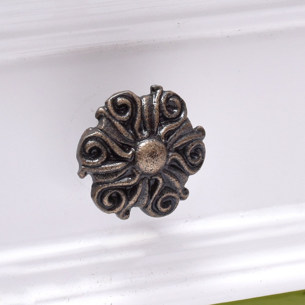 The antique finish of these knobs gives them a timeless look, ensuring they will never go out of style. Their intricate floral pattern makes them a standout piece, bringing character and elegance to any room.