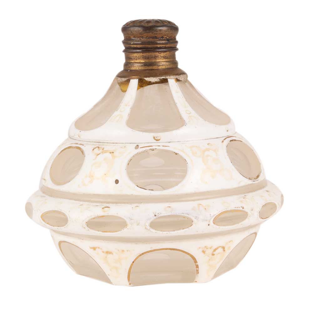 Elegant decorative white antiqued mirrored perfume bottle with brass cap.  Rare and collectible glass perfume bottle. This bottle is Ideal for collection, home decoration, and personal gifting.  This Is collectible empty glass bottle can also be utilised in everyday life.