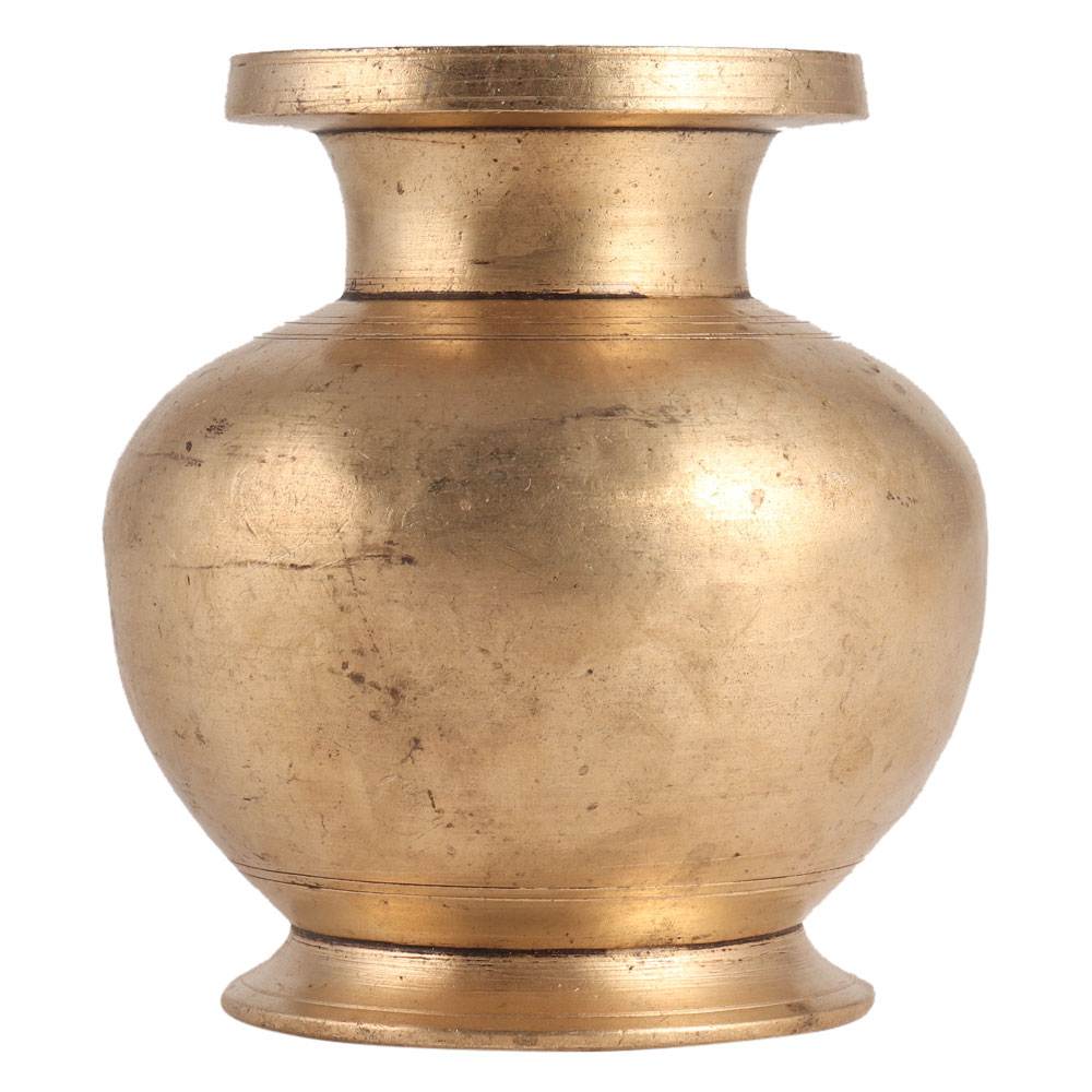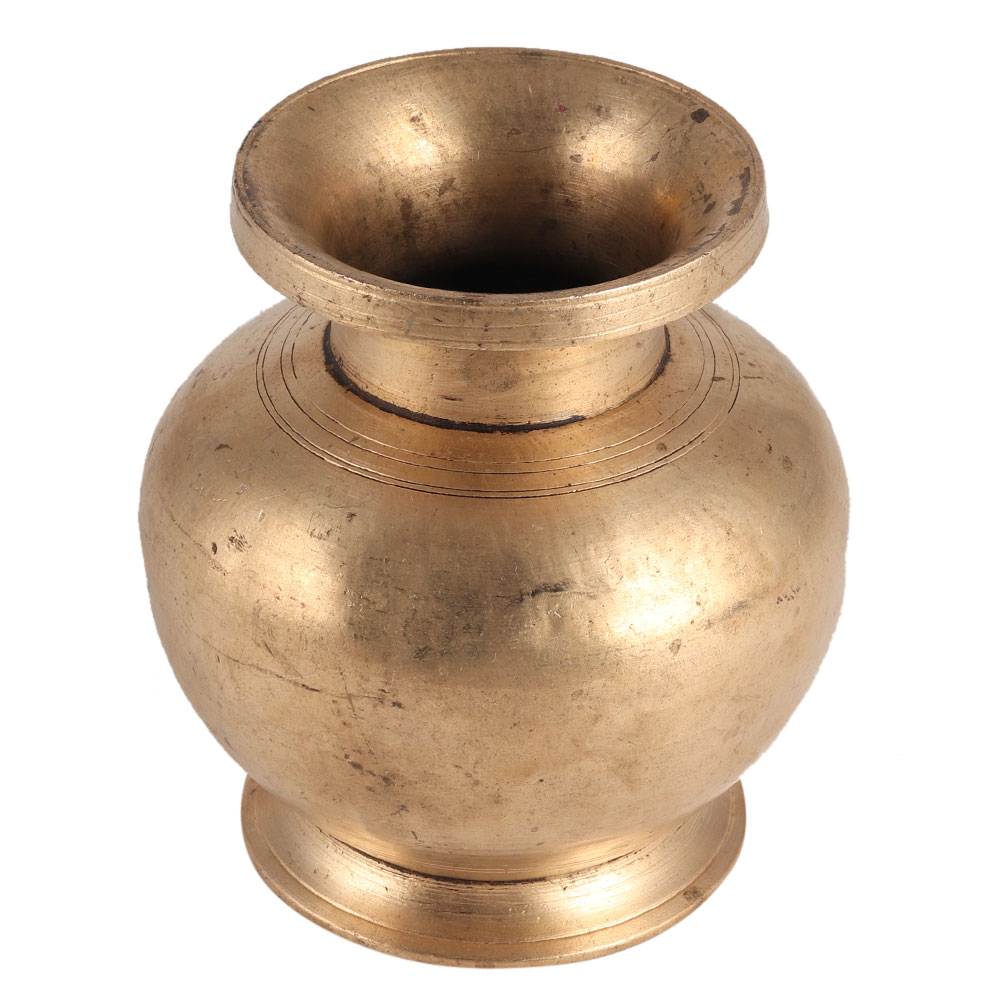 This brass South Indian water pot can be displayed in homes, kitchens, and temples where gods are worshipped. It makes an excellent showcase, home decor, and private gift. It has a golden antique finish.