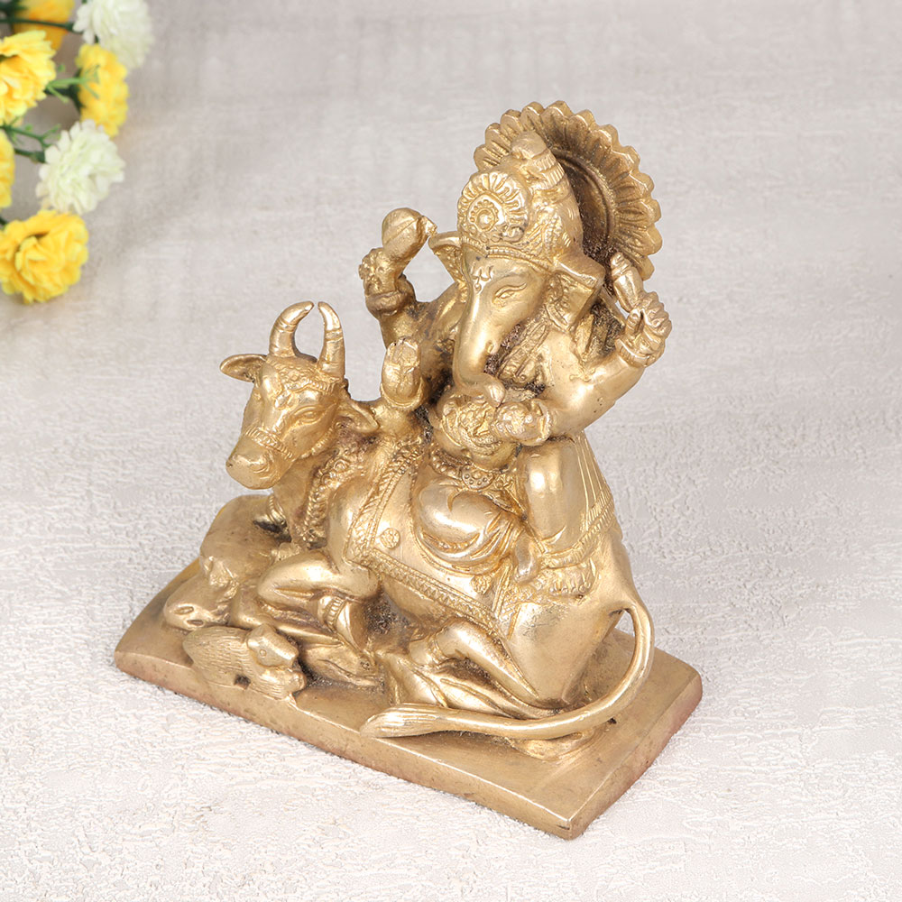 Buy a Brass Lord Ganesha Statue online which is an embodiment of timeless spirituality and exquisite craftsmanship. Meticulously handcrafted by highly skilled and experienced Indian artisans from high-quality brass, this statue boasts an antique golden finish that radiates opulence and charm. Seated alongside the revered Lord Nandi, and playful mushak who is Ganesha's loyal vahana, this intricately designed statue captures the essence of divine companionship. The amalgamation of spiritual symbolism and artistic finesse makes it a perfect addition to any sacred space, be it at home, in an office, restaurant, hotel, or café prayer room. The antique golden finish not only adds a touch of antiquity but also showcases the mastery of the artisans who poured their devotion into every detail. This timeless piece effortlessly transcends its physical form, inviting a sense of tranquillity and positive energy to any environment. Ideal for collectors with a penchant for vintage treasures, this Brass Lord Ganesha Statue is not just an aesthetic marvel but also a meaningful gift for your loved ones on special, festive, or auspicious occasions.