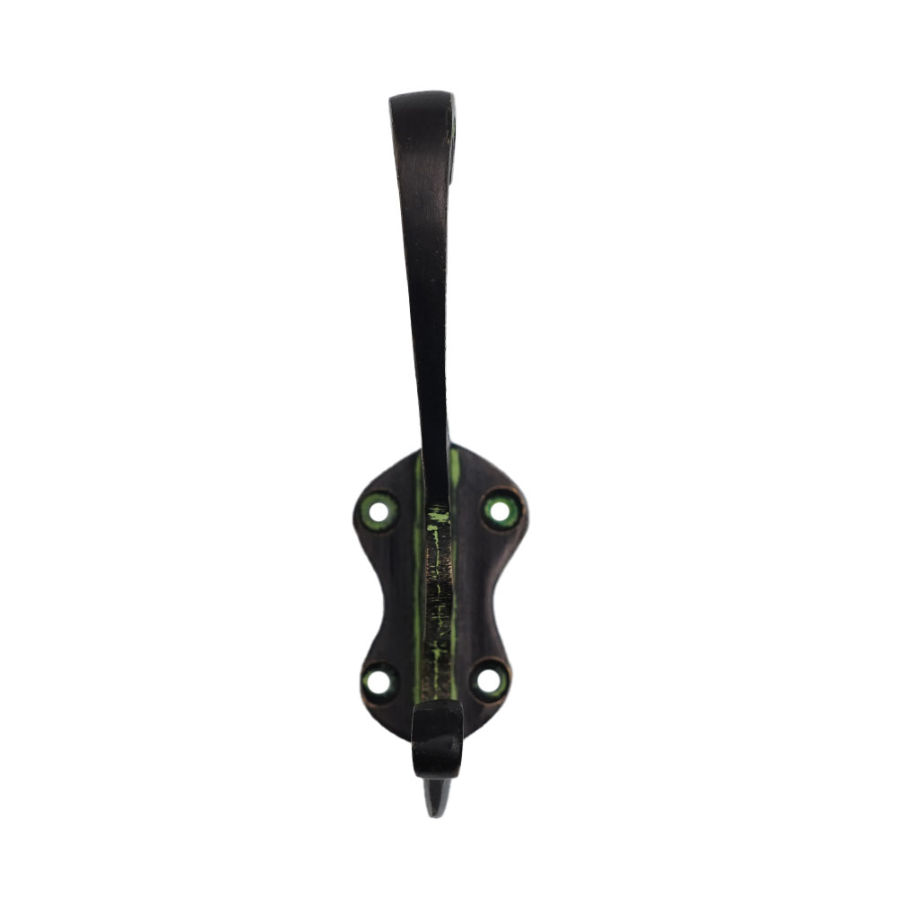 Q: Is the green finish natural or painted? Q: Can I use this in a bathroom? Q: Is it strong enough for heavy coats or bags? Q: Do mounting screws come with the hook? Q: Will the color fade over time?