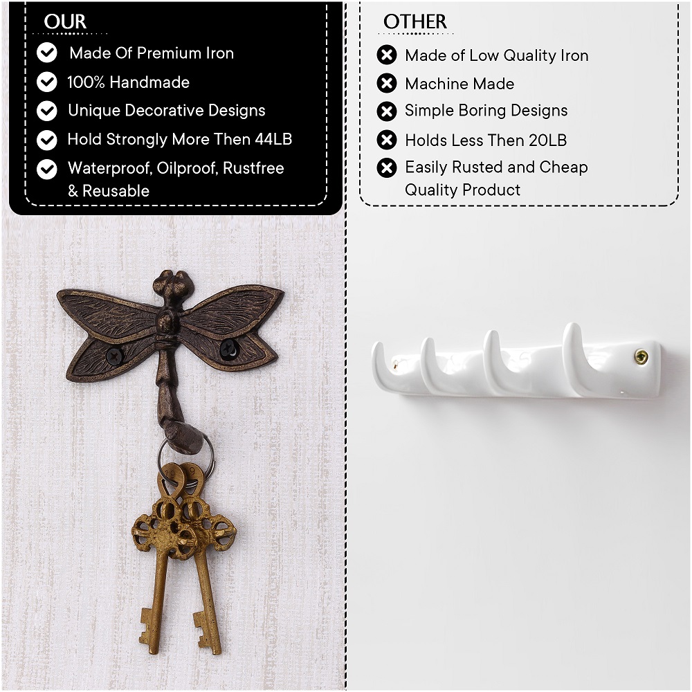 Bring a whimsical yet functional touch to your entryway or hallway with the Antique Iron Dragonfly Key Wall Hooks. Crafted from solid iron and shaped into an elegant dragonfly, this piece beautifully combines rustic artistry with everyday utility. The antique finish enhances its vintage appeal, while the sturdy hooks offer reliable support for keys, leashes, or small accessories. Perfect for nature lovers or anyone seeking decor that’s both decorative and purposeful.