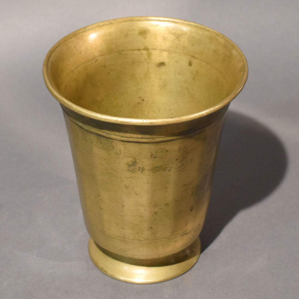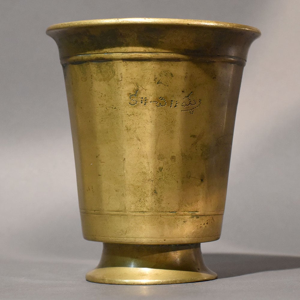 This antique patina brass pedestal pooja cup reflects traditional Indian metal artistry with a bold, grounded presence. Crafted in a classic cylindrical form, the cup features a wide flared rim and a gently contoured body that rests on a solid, rounded base. The pedestal elevates the vessel slightly, giving it ceremonial importance while ensuring stable placement during rituals or daily use. The surface displays natural aging marks and deepened tonal variations that enhance its vintage character. Fine linear band detailing near the rim and base adds subtle structure to the otherwise minimal design. The softly worn brass finish carries visible patina, reinforcing its old-world charm and handcrafted authenticity. Inside, the cup offers a smooth, functional finish suitable for water, milk, panchamrit, or other ritual offerings. Brass vessels have long been valued in traditional households and temples for their durability and cultural significance. This piece fits seamlessly into pooja setups, festive ceremonies, temple Decor, or heritage dining arrangements. The balanced proportions and sturdy base provide both visual weight and practicality. Each cup reflects slight surface variations, ensuring individuality while maintaining structural consistency. Over time, the brass naturally deepens in tone, further enhancing its antique appeal.