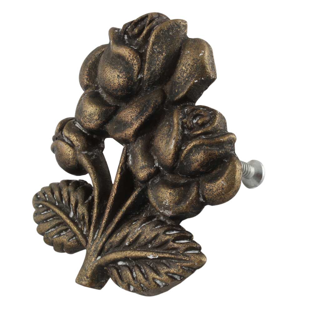 Enhance your furniture with the Antique Rose with Branch Iron Dresser Knob. This knob showcases a beautifully detailed rose design complemented by branching accents, crafted from sturdy iron and finished with an antique patina. It's perfect for elevating dressers, cabinets, and drawers, adding both style and practicality to your space.