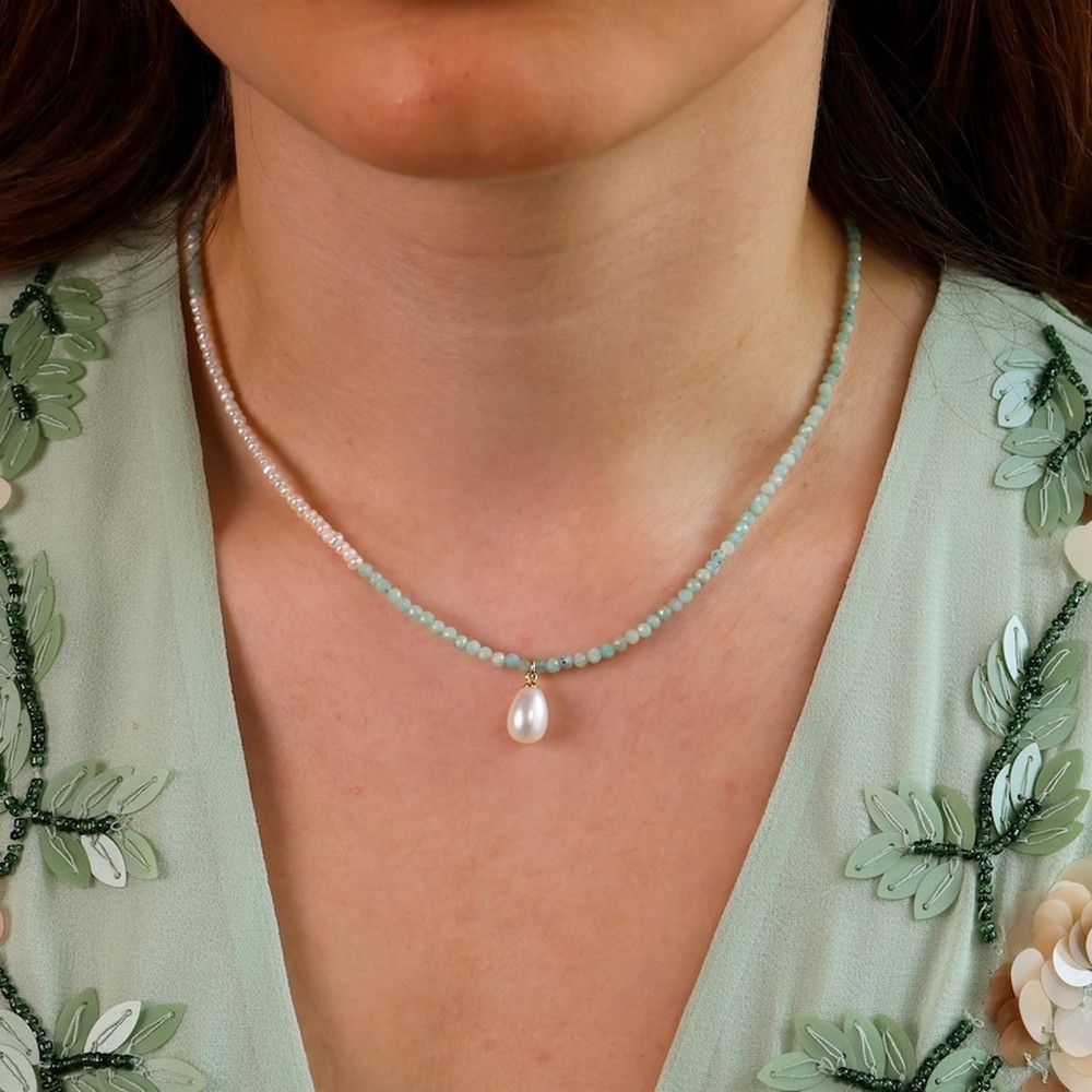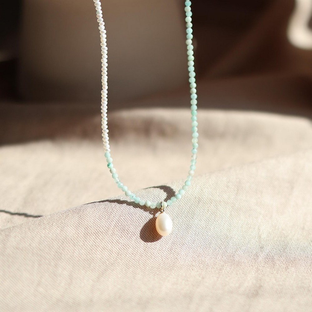 Pair this aquamarine and pearl necklace with pastel outfits or flowing dresses, and store it in a soft-lined jewelry pouch to protect the beads and pendant.