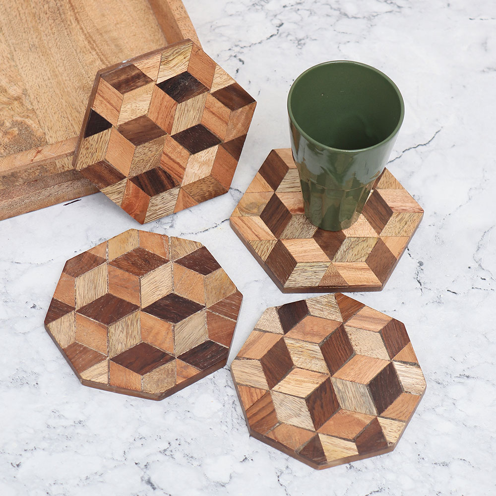 Buy our exquisite set of wooden coaster sets online which is crafted with the utmost precision and care by highly skilled and experienced Indian artisans. Made from high-quality wood, this collection features four stunning coasters, with two designed in an elegant hexagon shape and the other two boasting an enchanting octagon shape. Each coaster showcases different shades of rich brown, accentuating the natural beauty of the wood. These coasters are not only practical but also serve as stunning decorative pieces for your home or office. The intricate cube pattern adds a touch of sophistication to any setting, making them a delightful addition to your table tops. These best wooden coaster sets are ideal for protecting your surfaces from unwanted stains caused by water, tea, juice, or coffee glasses. They are suitable for various occasions and venues, whether it\'s your home, office, restaurant, hotel, or cafe. Embrace the essence of craftsmanship and present these wooden tea coaster sets as thoughtful gifts to your loved fours on special or festive occasions.