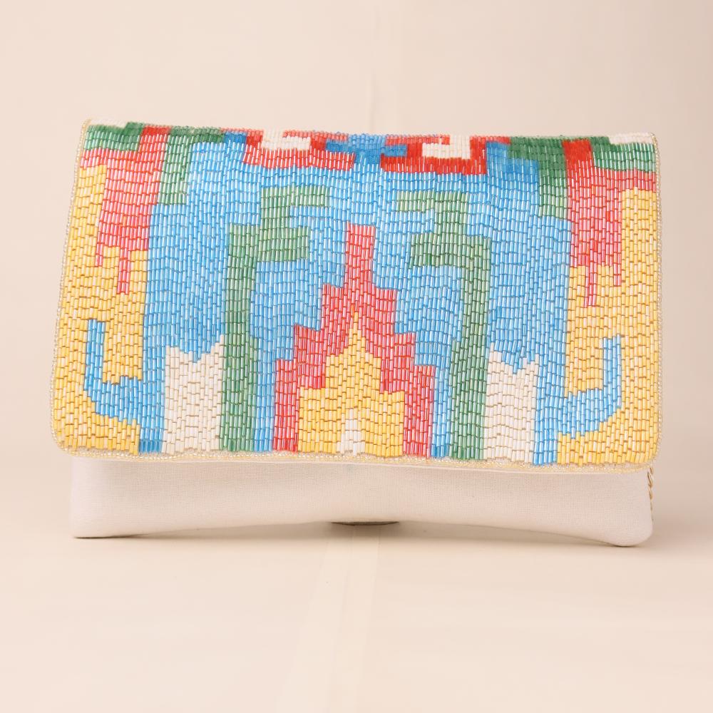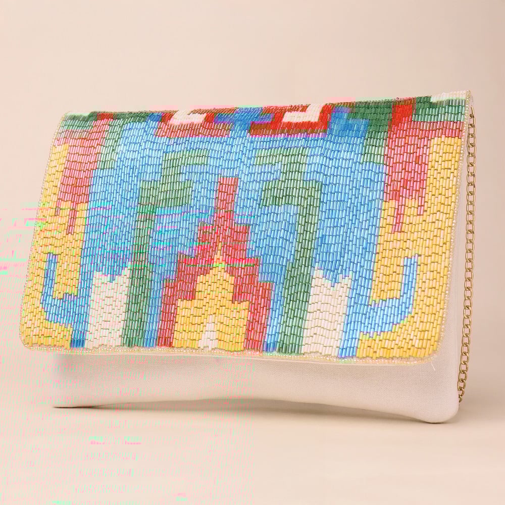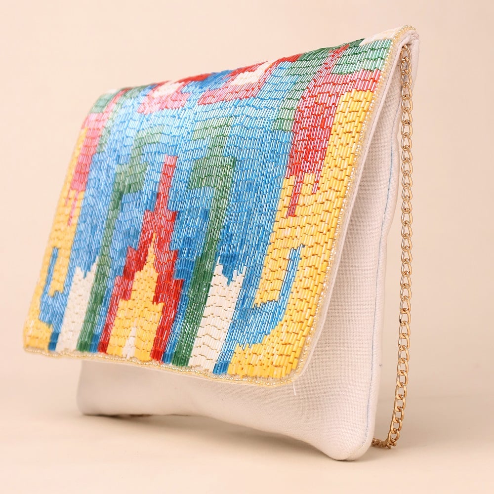 Bring vibrant sophistication to your ensemble with the Aurora Mirage clutch, a mesmerizing accessory adorned with hand-beaded geometric patterns that echo the spirit of abstract art. Its structured silhouette is complemented by a soft fabric base and a neatly concealed magnetic closure. Whether you're headed to a summer soirée or an art-inspired evening, the detachable gold-tone chain strap lets you effortlessly switch from a shoulder sling to a stylish handheld clutch.