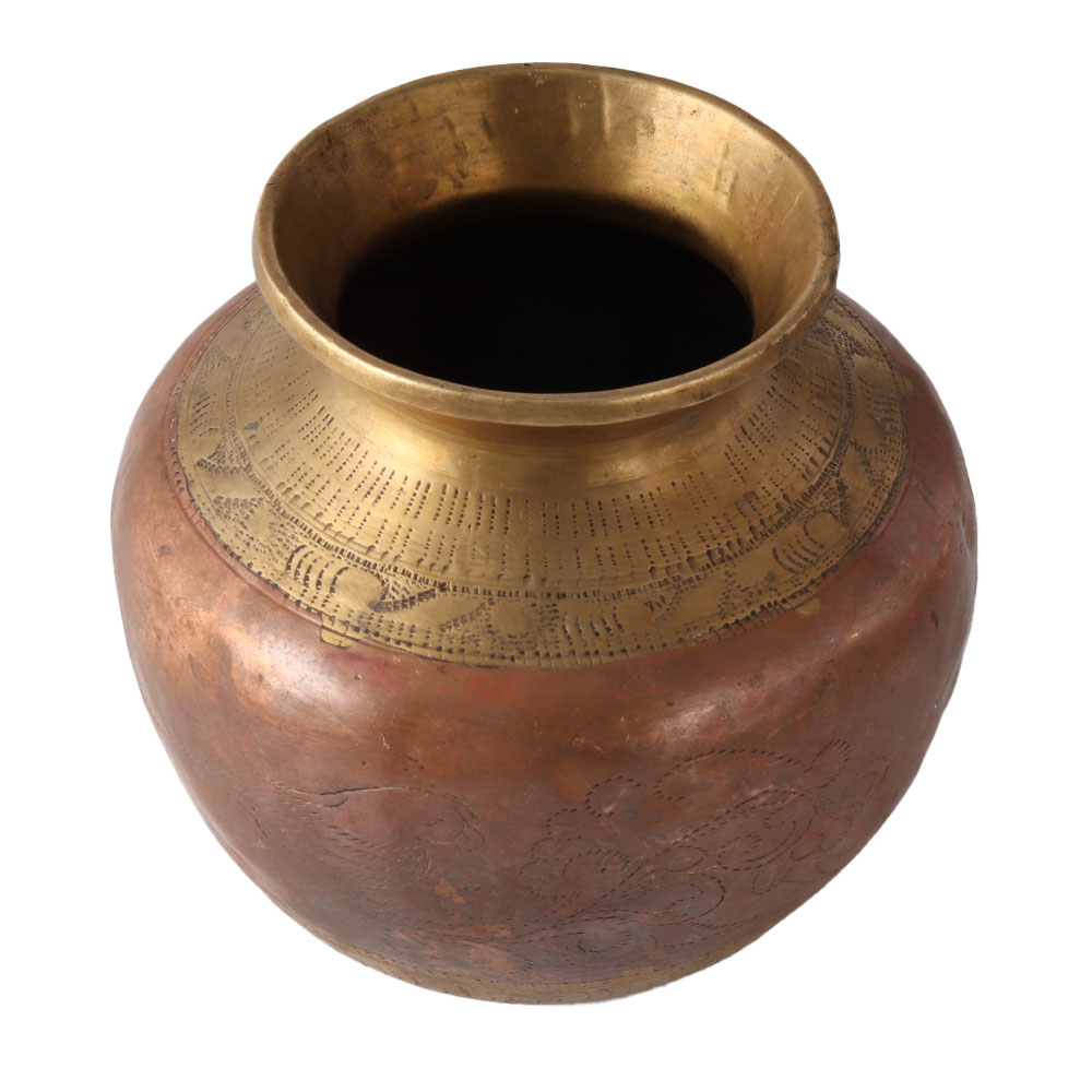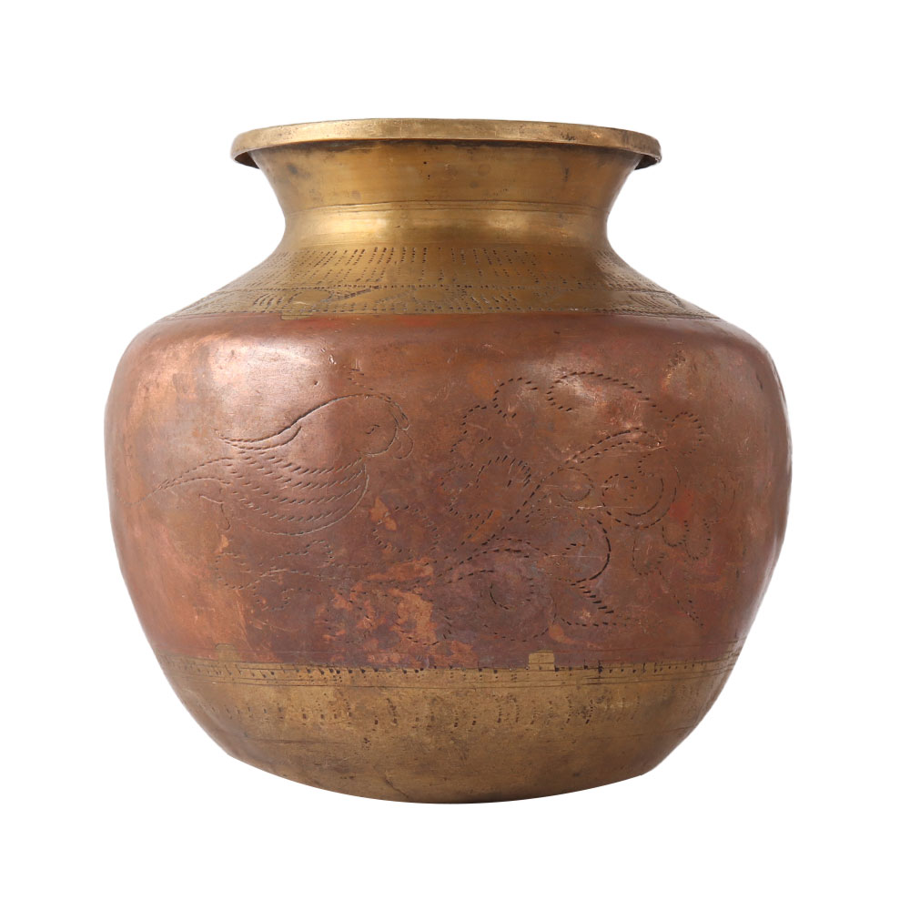 Handcrafted brass and copper holy water pot, also known as the Ganga Jamuna. Lota was a water vessel that was most likely used for religious purposes, such as washing temple gods or storing Ganga Jal. Wedding gifts, home decor, outdoor decor, garden decor, hotel, spa, and stage decor This lota gets its name from the use of brass and copper separately in its construction. The Ganga river's waters are golden yellow, represented by brass, and the Jamuna river's waters are reddish, represented by copper.