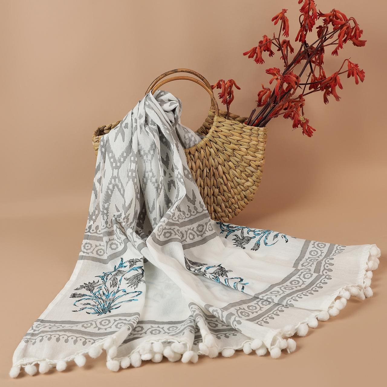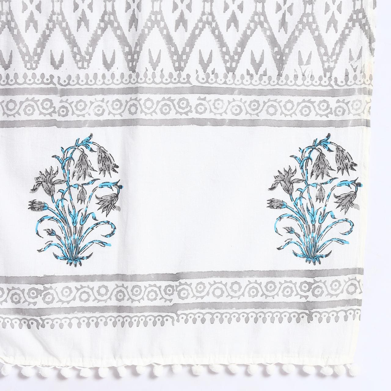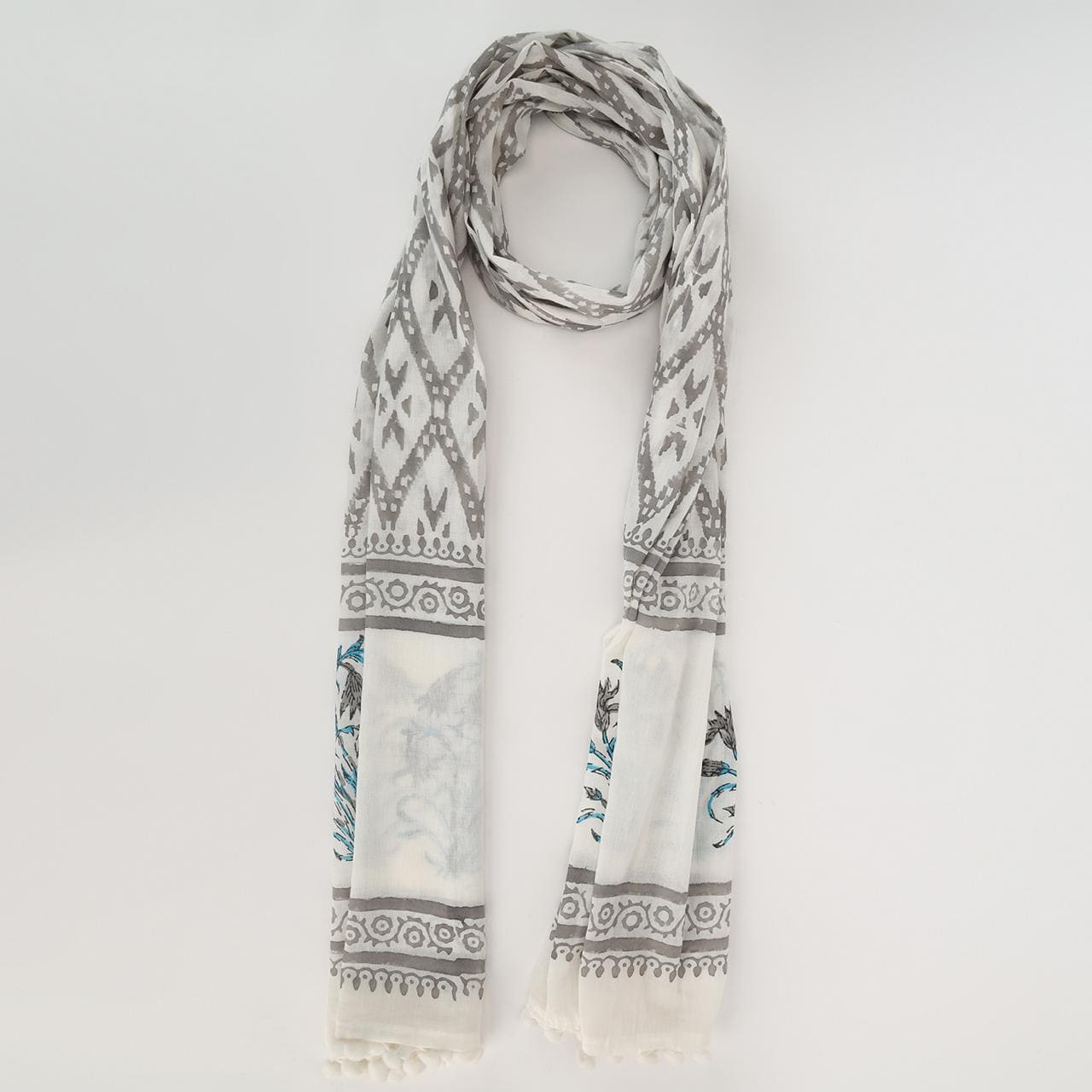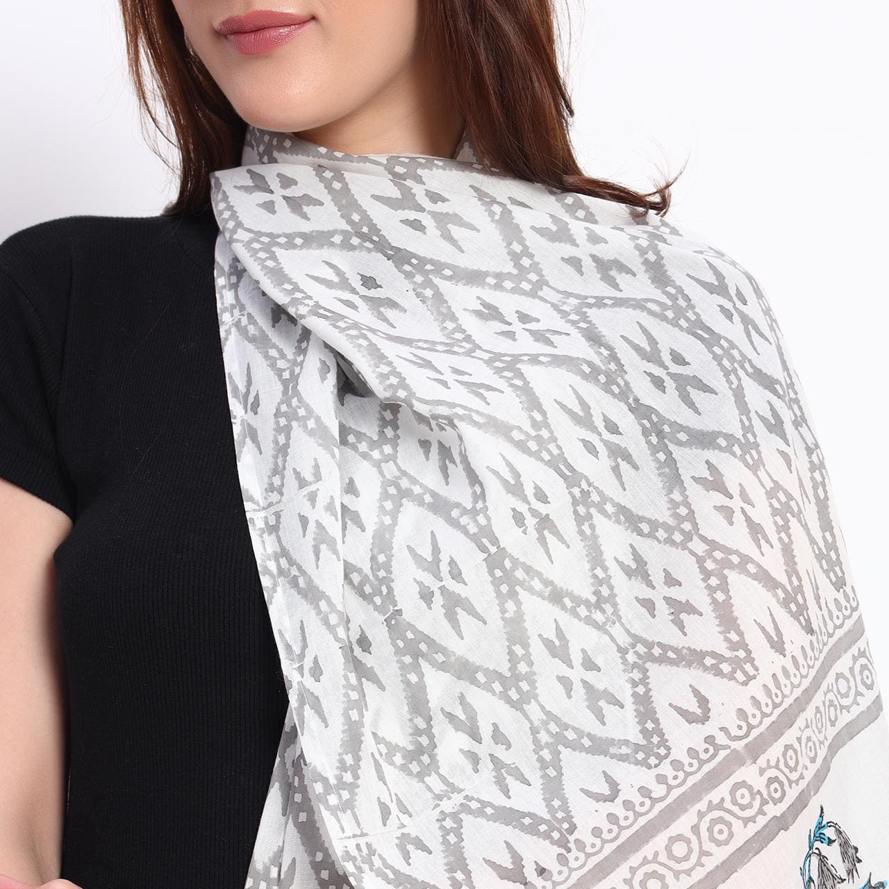 This stole exudes timeless elegance with its intricate patterns and delicate floral motifs. The subtle interplay of grey geometric designs and vibrant blue accents offers a perfect blend of tradition and modern sophistication. Crafted with precision, it's ideal for elevating any ensemble, making it a versatile accessory for both casual and formal occasions.