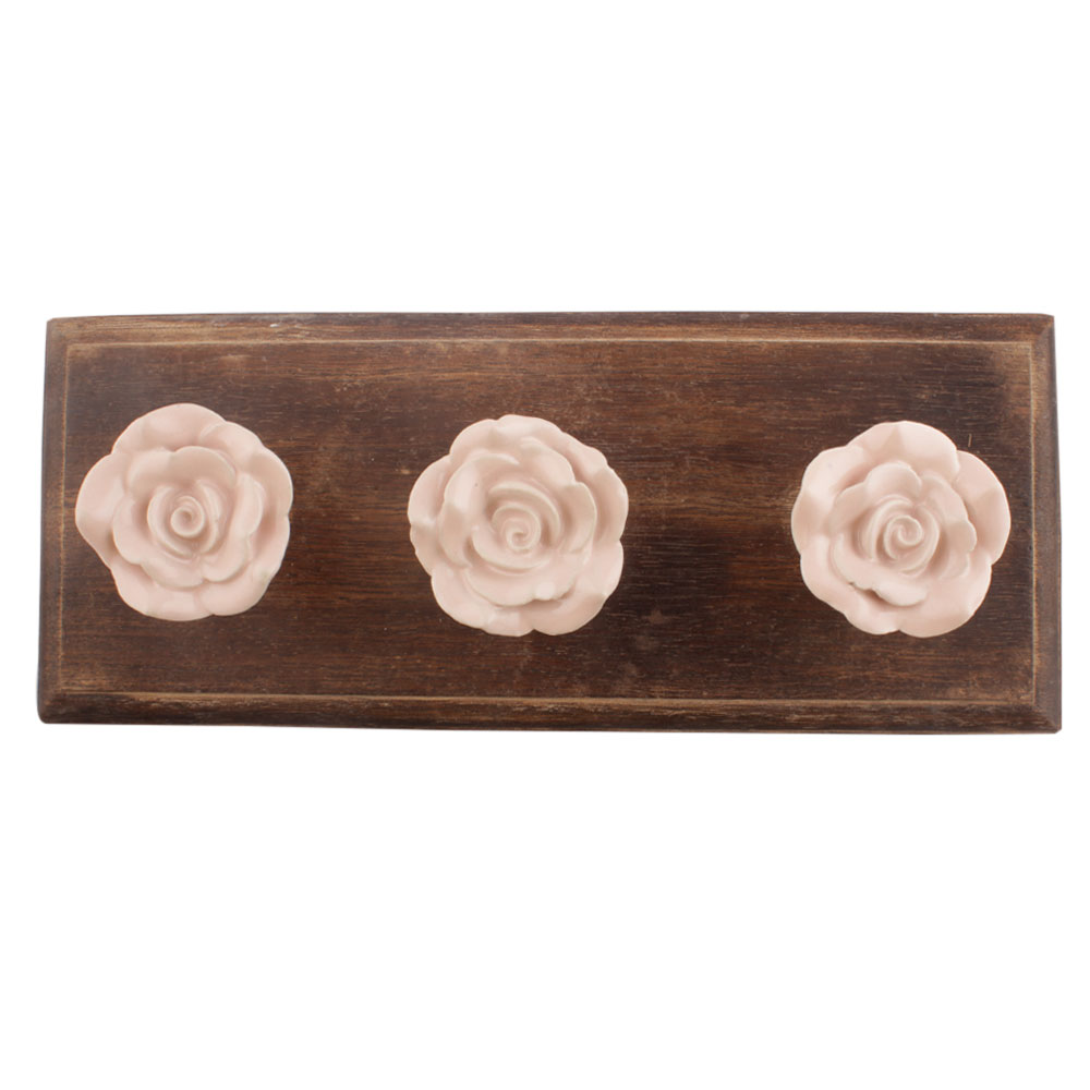 Baby Pink Rose Flower Ceramic Wooden Hook. A Perfect Complement to the Soft Tone of the Wood are these White Traditional Hat and Coat Hook Made of Genuine Porcelain and Brass. It can be used to Hang Jewelry, Leashes, Towels, Scarves, Light Weight Sweaters, Caps etc.