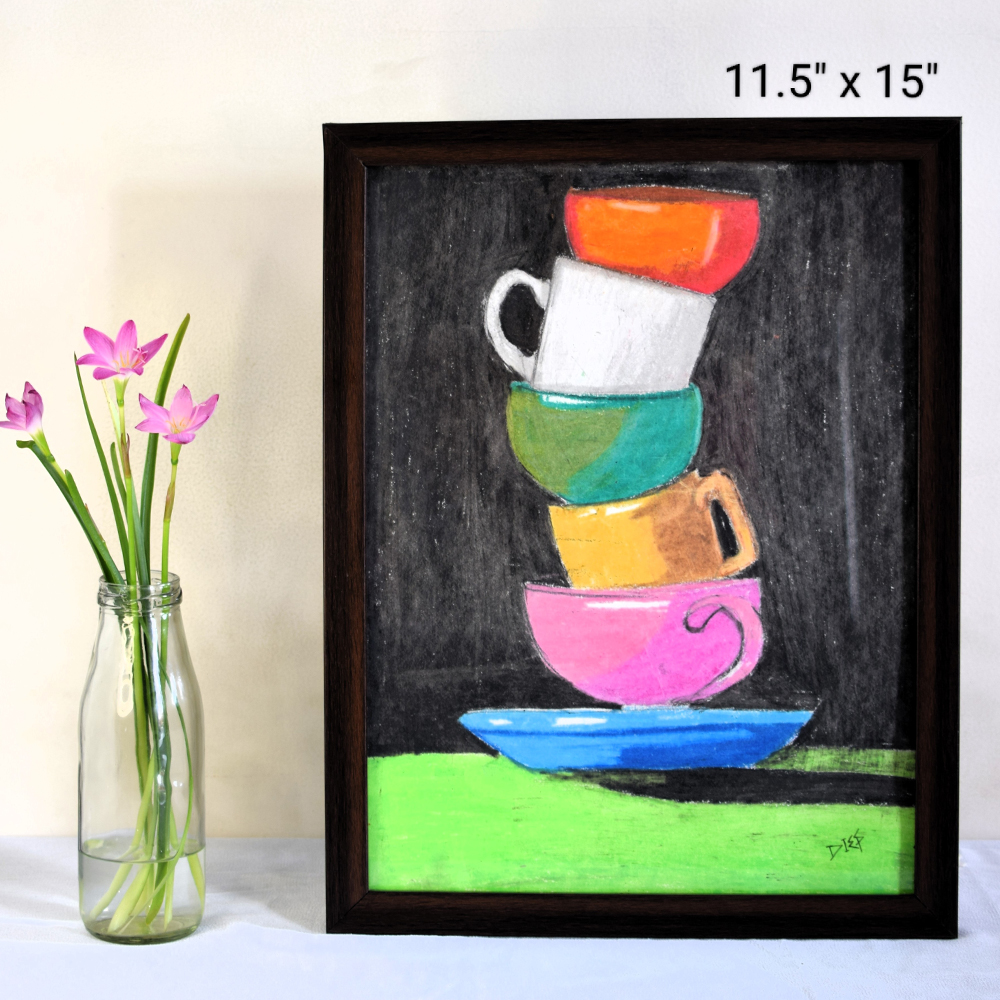 • Balance Still Life with Stacked Cups in Oil Pastels on Paper by Artist Dimpana | 11.5 x 15 Inches