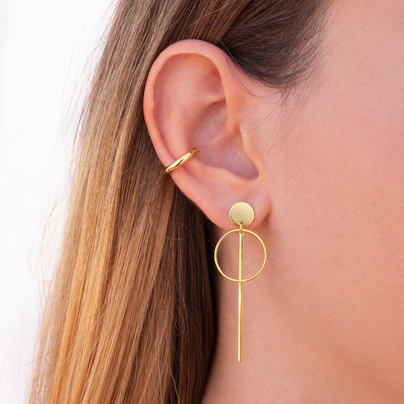 These Bar and Hoop Earrings combine clean geometry with a refined minimalist aesthetic, making them an essential accessory for modern jewelry lovers. Crafted from solid brass and plated in radiant gold, each earring features a sleek bar suspended within a smooth hoop—creating a balanced, architectural silhouette. At 2.16 inches, they deliver striking length without heaviness, bringing sophistication and movement to every look. Handmade with precision, these earrings embody the beauty of intentional, sculptural design.